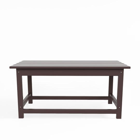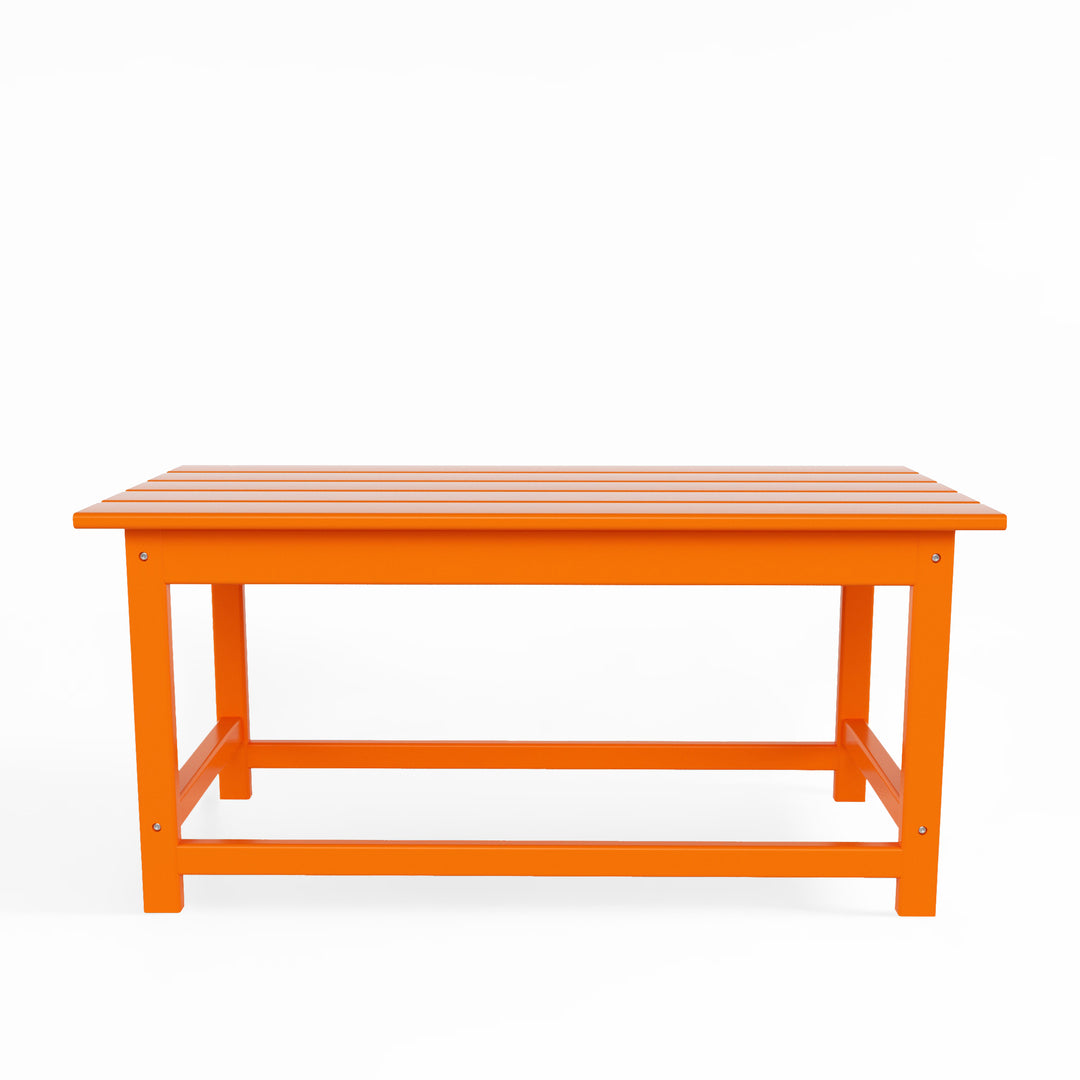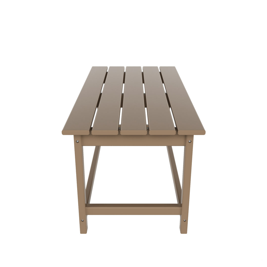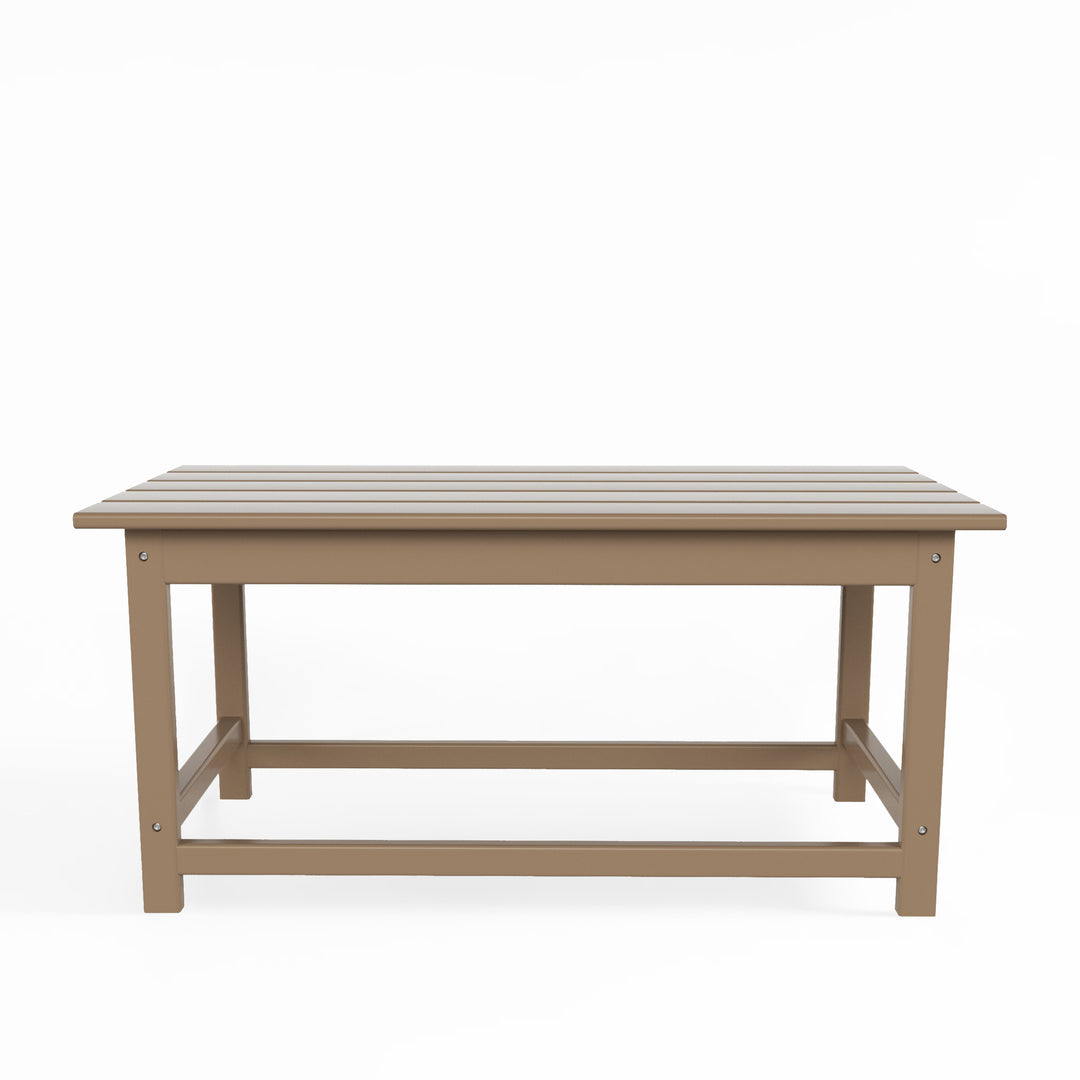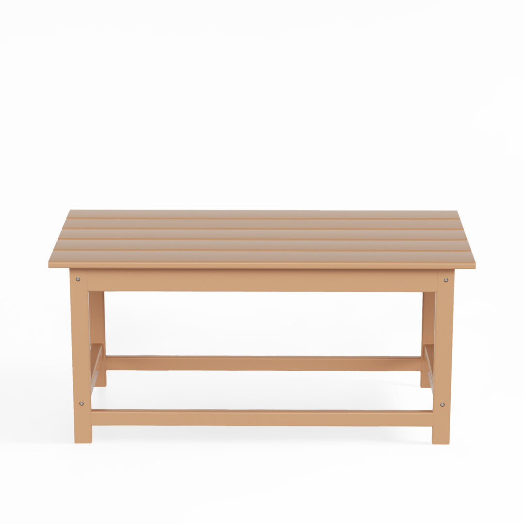Having a place to sit is always the first thing on your mind when furnishing, but don't forget about the accessories that make it shine! This 35" inch coffee table is sure to complete your patio or living room and match with your Adirondack chairs. Created with eco-friendly HDPE material adds durability and can withstand the outdoor elements thanks to the HDPE's natural UV and weather resistant. The table is made to look like natural wood without any of the disadvantages of natural wood, meaning that this table isn't prone to splinters, cracks, or peeling. This table is perfect for the outdoors and will have your home looking great with the semi-gloss finish that is sure to shine.