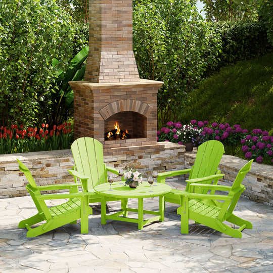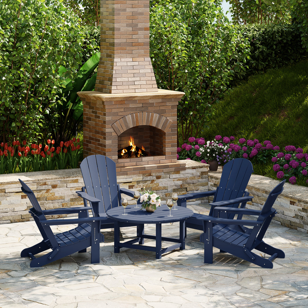 Gather around with your loved ones around our charming 5-piece Adirondack conversation set. Crafted with a durable HDPE all-weather material that is perfect for the outdoors with its resistance to UV and fading. Foldable chairs for easy storage and contoured seats to help relieve tension on your lower half and combined with the wide 38" round coffee table that provides plenty of space for all your drinks and a center umbrella hole that can fit 1.5" umbrella poles for added shade.