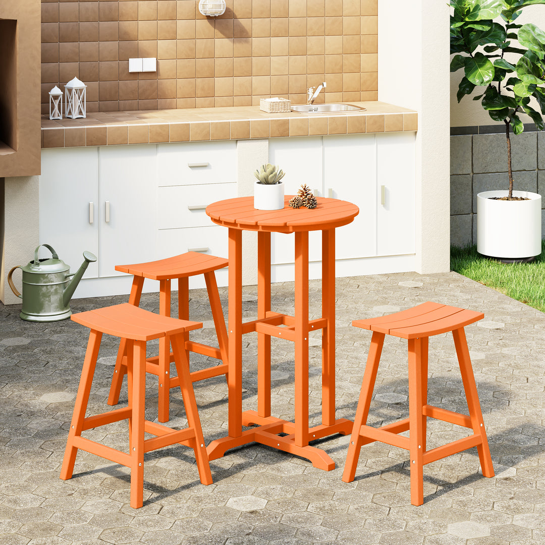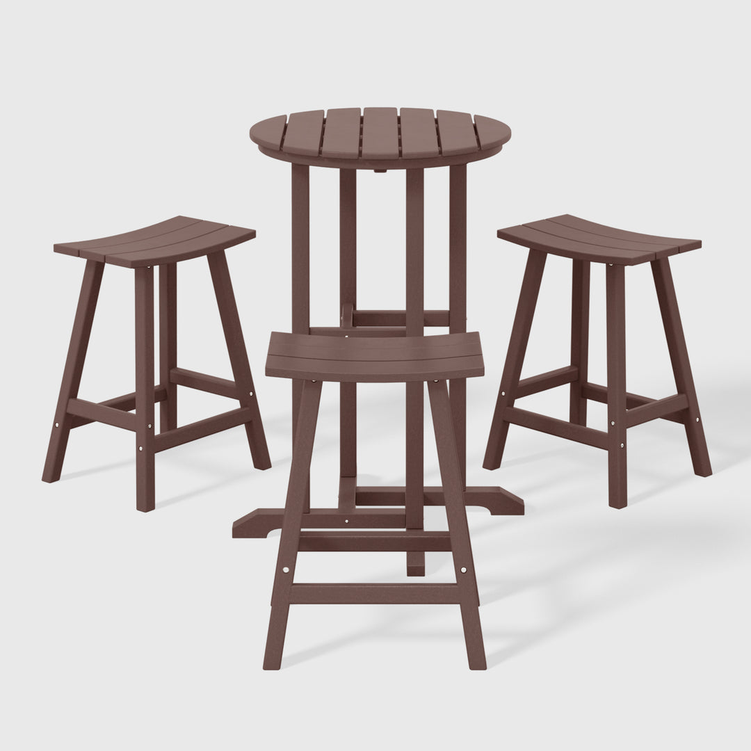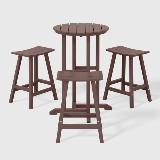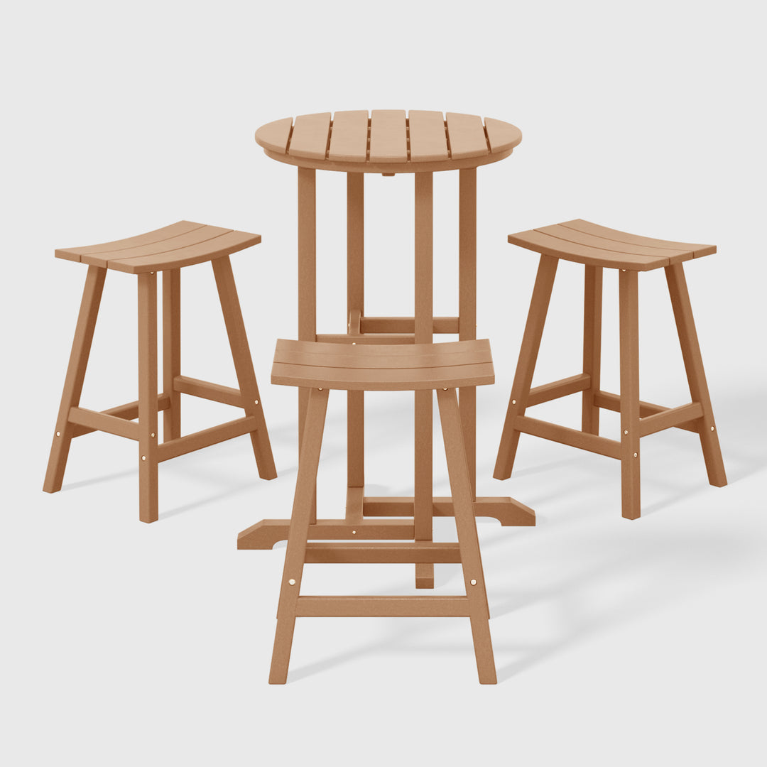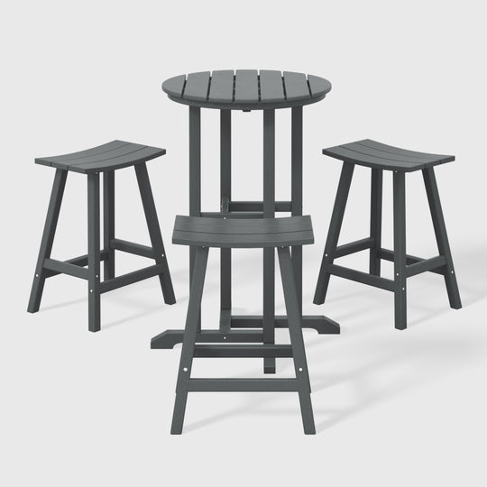 Elevate your outdoor haven with our exclusive patio furniture set—a refined ensemble featuring a distinguished 37" counter-height bistro bar table and three exquisite 24" counter-height bar stools, seamlessly blending style and opulent comfort. Immerse yourself in a palette of alluring, fade-resistant colors meticulously crafted from resilient HDPE material. This enchanting material not only boasts UV resistance but acts as a shield against the relentless sun, ensuring enduring magnificence. Bid farewell to concerns about splintering, cracking, chipping, peeling, or rotting—our HDPE stands as a testament to enduring luxury, requiring no painting, staining, or waterproofing. From the sumptuous saddle-style seats providing an extra layer of comfort to the robust leg design on the bistro table for added stability, this set is meticulously designed to elevate your outdoor experience. Let us redefine your outdoor patio—a space where family and furniture seamlessly unite in absolute splendor!