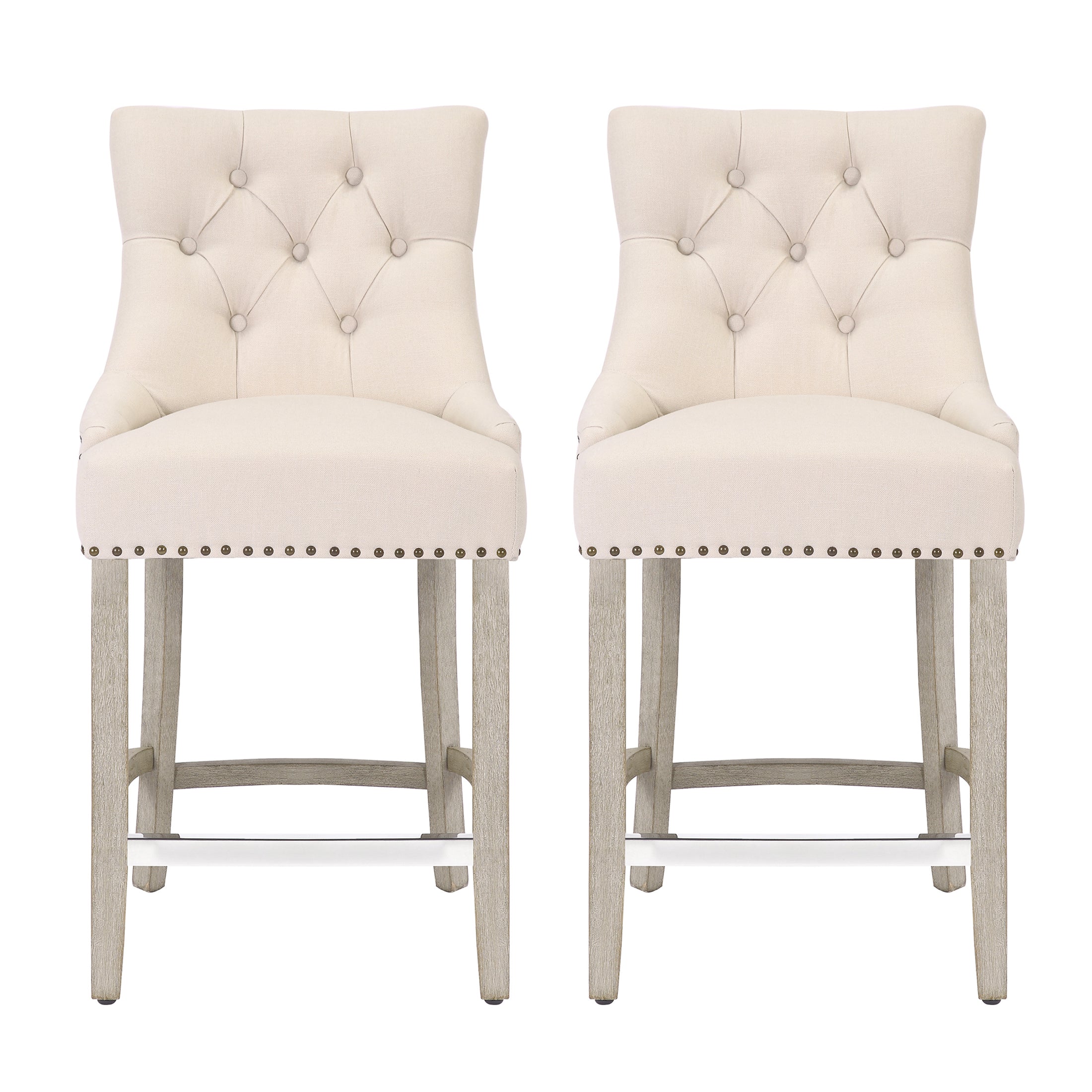 Lined with an artistic bronze nail head trim, this 24" seat height armless button-tufted stool is designed for premium dining comfort. The soft linen upholstery and foam-filled cushion keeps you comfortable for long periods of time. Place your feet on the silver footrest for additional leisure. This wing back inspired counter stool is sturdy and durable thanks to the antique gray solid rubberwood legs.