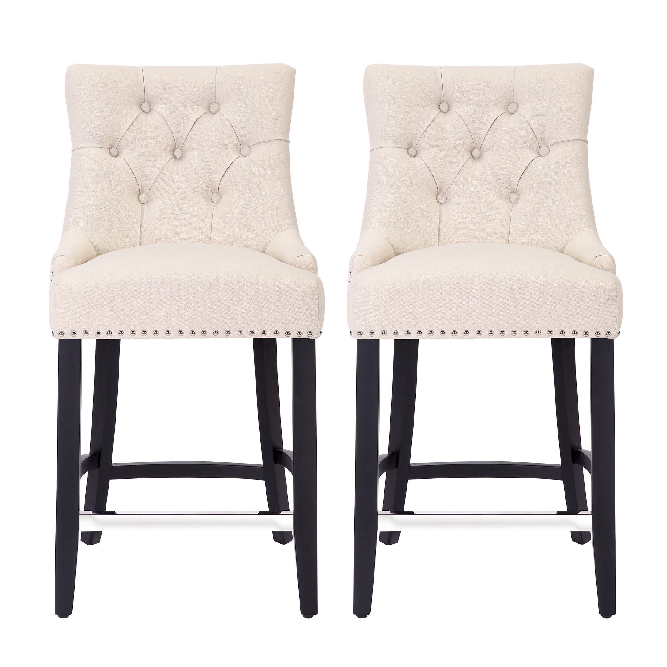 Lined with an artistic bronze nail head trim, this 24" seat height armless button-tufted stool is designed for premium dining comfort. The soft linen upholstery and foam-filled cushion keeps you comfortable for long periods of time. Place your feet on the silver footrest for additional leisure. This wing back inspired counter stool is sturdy and durable thanks to the antique gray solid rubberwood legs.