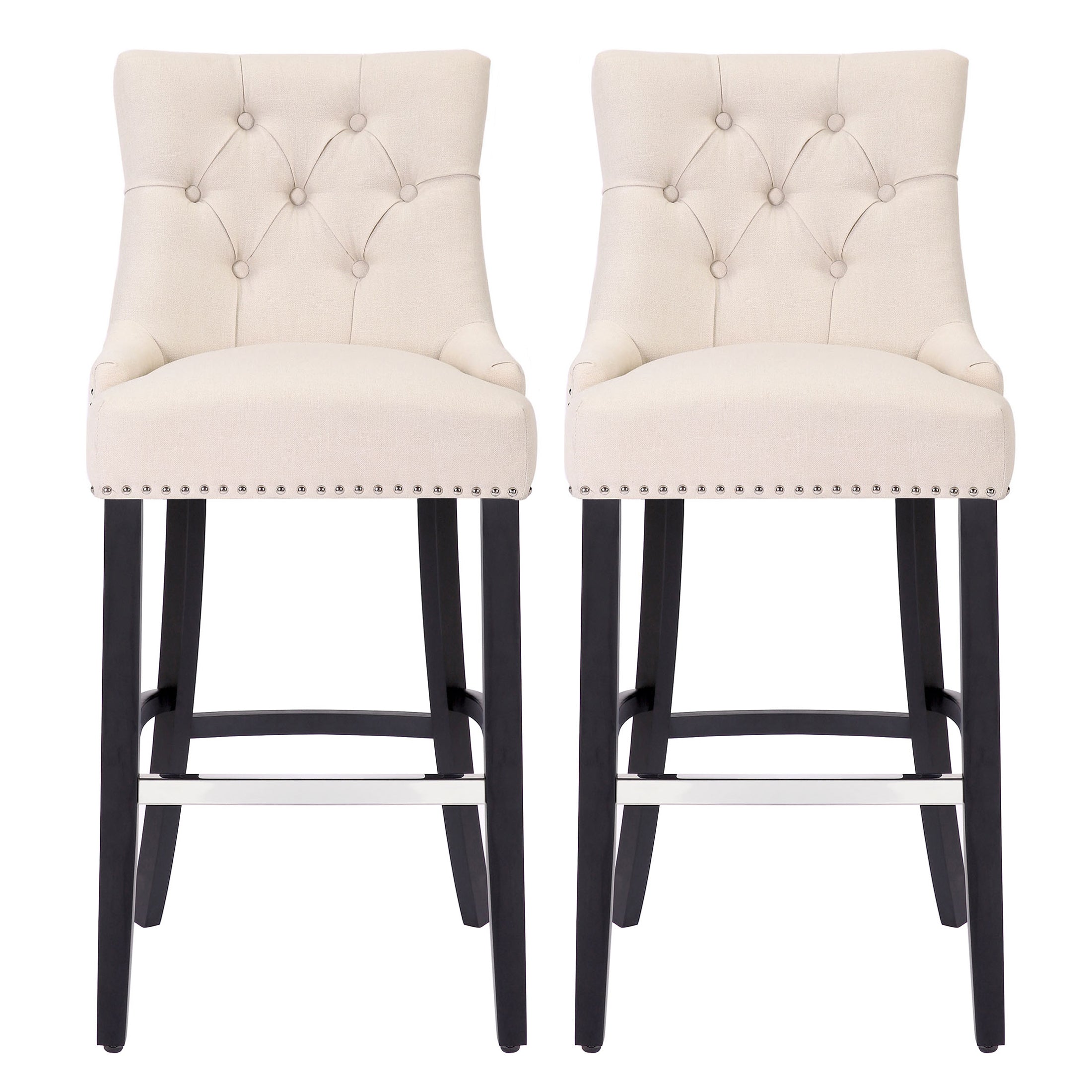 Lined with an artistic bronze nail head trim, this 29" seat height armless button-tufted stool is designed for premium dining comfort. The soft linen upholstery and foam-filled cushion keeps you comfortable for long periods of time. Place your feet on the silver footrest for additional leisure. This wing back inspired counter stool is sturdy and durable thanks to the antique gray solid rubberwood legs.