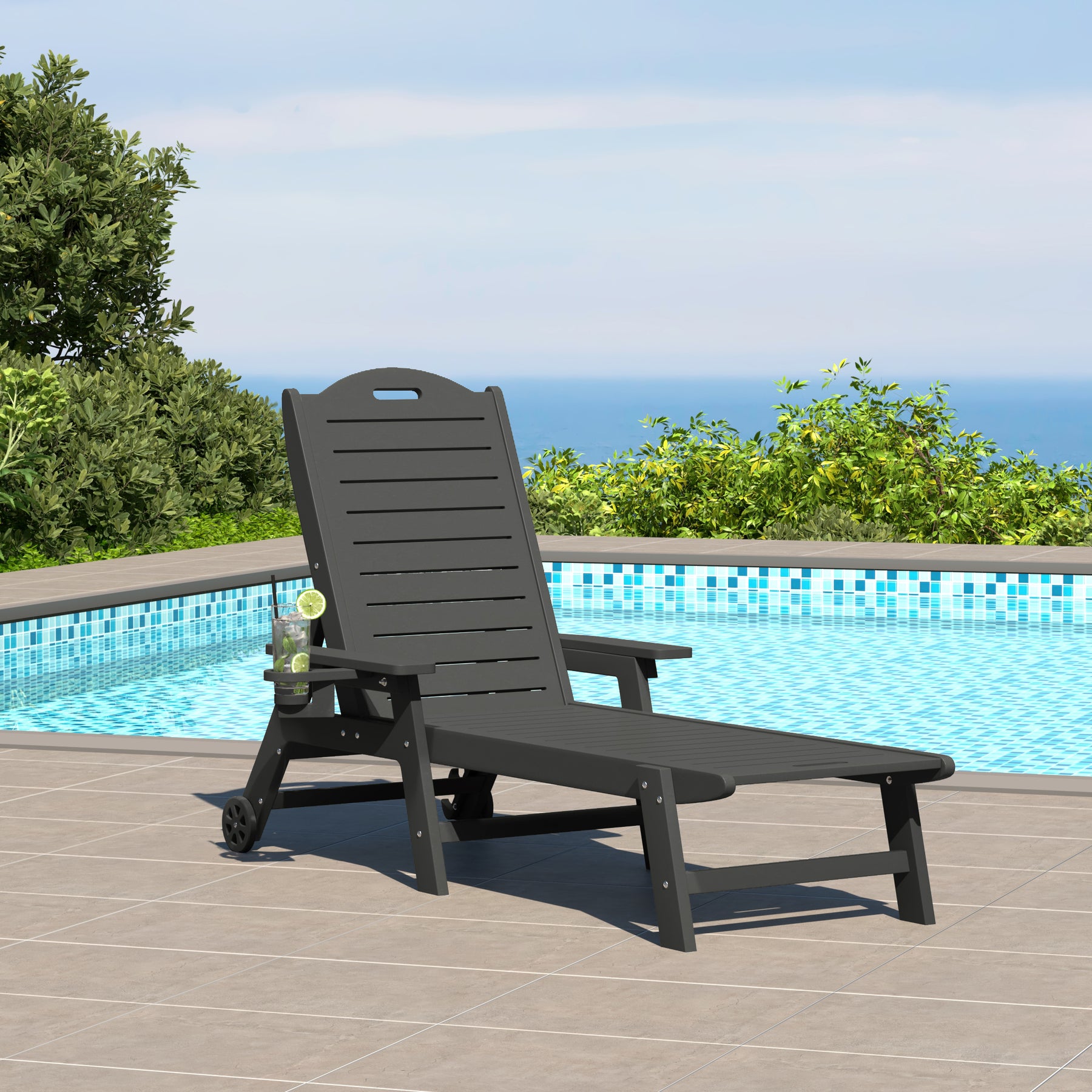 Unwind in effortless style with our Outdoor HDPE Patio Chaise Lounger, thoughtfully designed for modern outdoor living. Crafted from premium HDPE, this outdoor chaise lounge chair offers exceptional durability and fade resistance, maintaining its refined color and smooth finish season after season. With five adjustable backrest positions, including a fully flat setting, you can seamlessly shift from sitting upright with a book to reclining for a sun-soaked afternoon. The integrated 3" cup holder accommodates most tumblers and cups—keeping your favorite drink within reach—while discreet rear wheels make repositioning the patio lounger simple and seamless. Whether poolside, on the deck, or nestled into your garden retreat, this patio chaise lounge combines clean lines, comfort, and resilience. Designed to elevate any outdoor lounge space, it’s a timeless, low-maintenance piece that invites relaxation and complements any contemporary setting making it the perfect outdoor chaise.