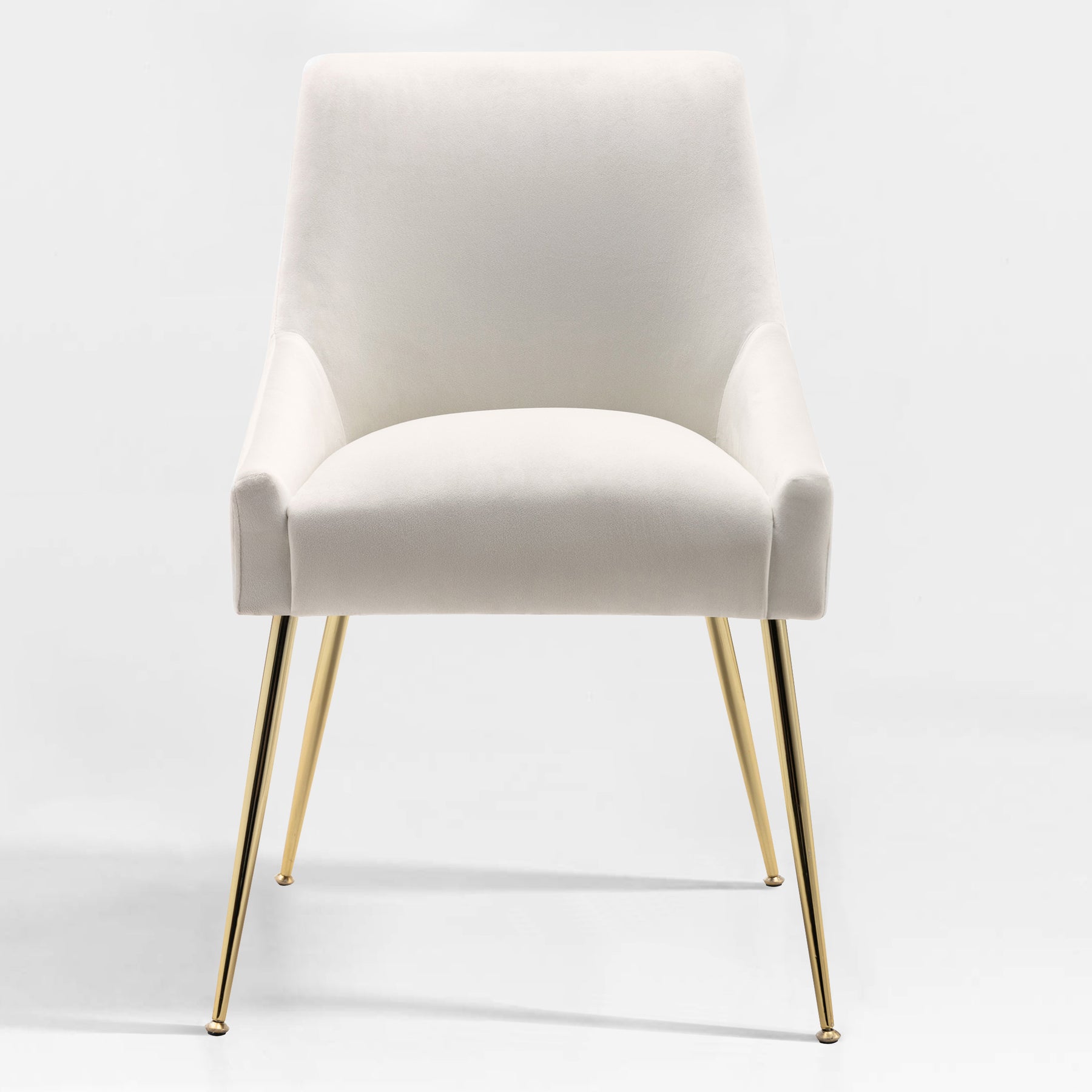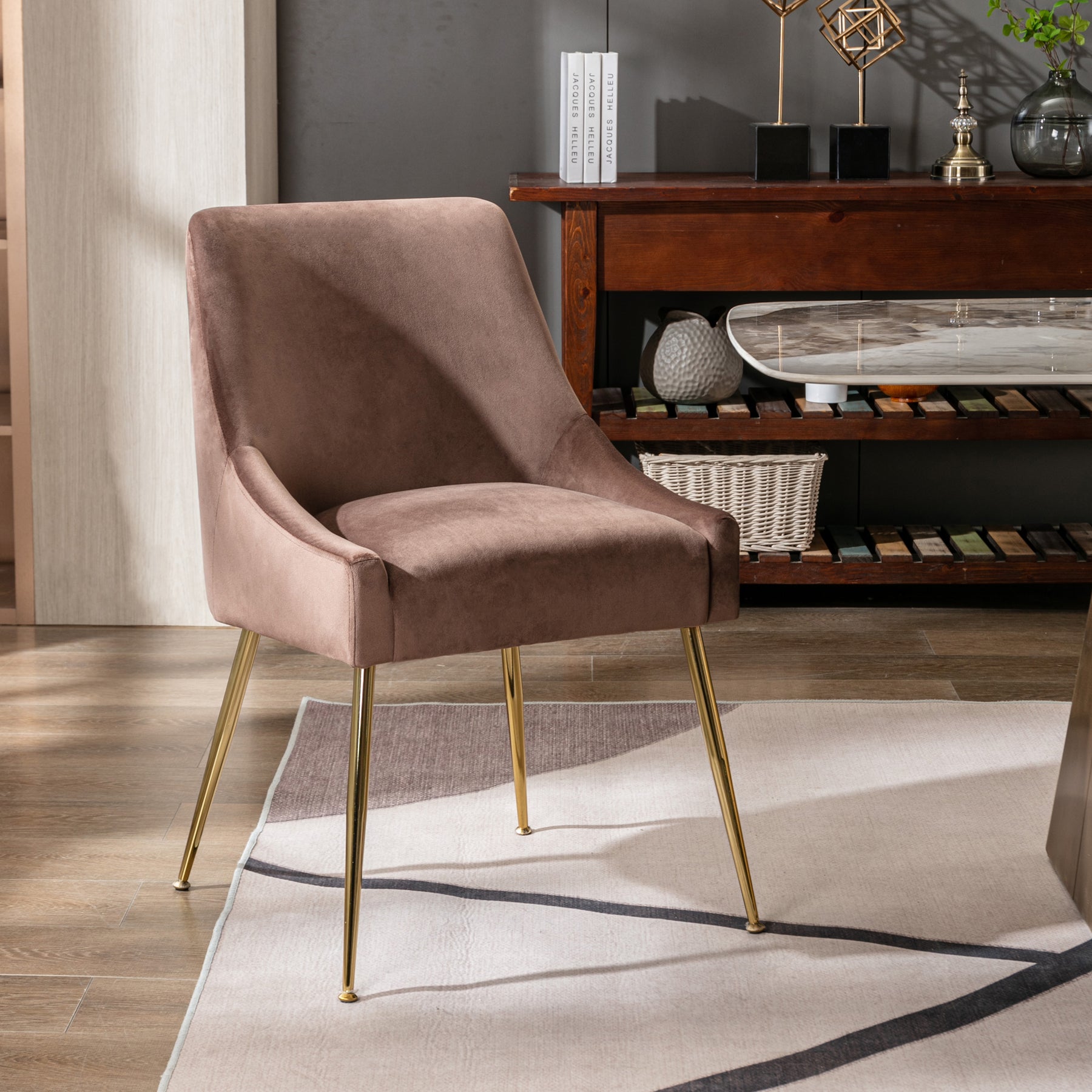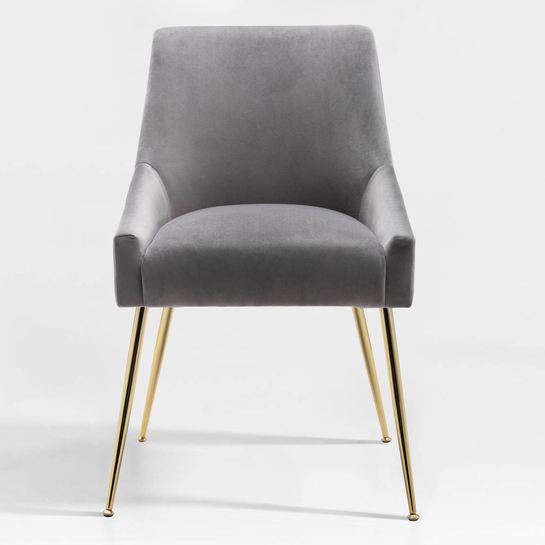 Add a touch of beauty, flare, and elegance to every room. This soft upholstered velvet fabric gives a warm and comfortable feeling to any room that is sure to complement it. The chair stands out with its rounded ball feet, elegant handle on the back of the chair, and golden tapered metal legs with a polished gold finish, which combined with the beautiful soft velvet fabric makes it a standout piece.