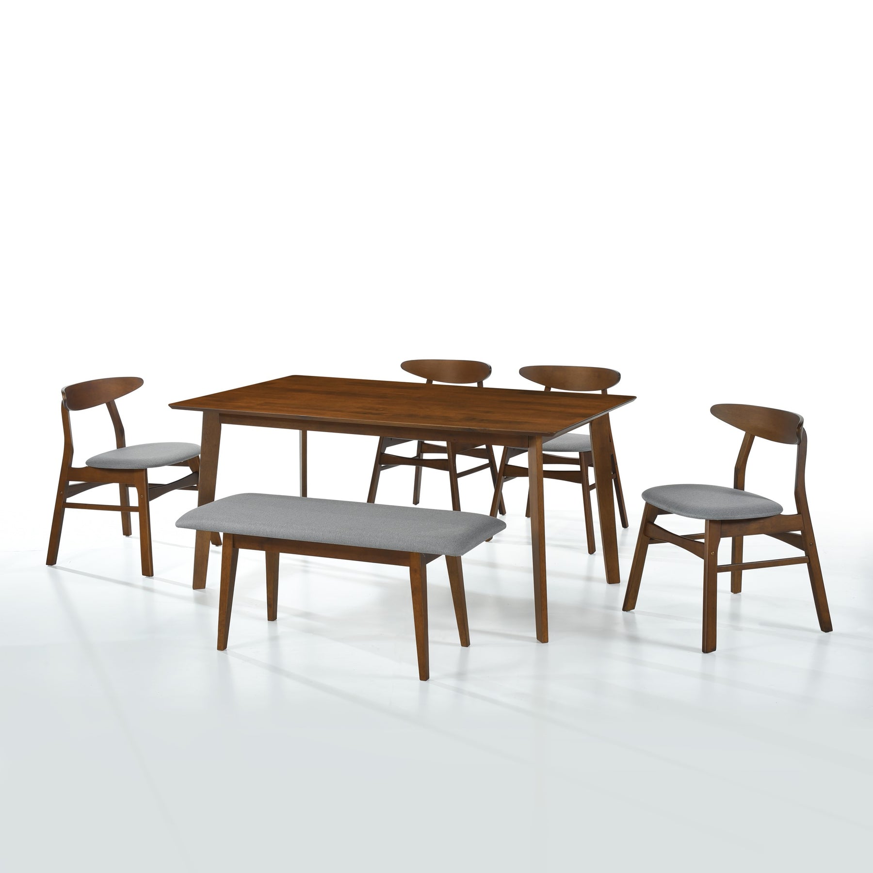 Host your next gathering with this six-piece mid-century rectangular table set. Made from rubberwood in a dark walnut finish, this durable table set blends perfectly with almost any décor style to complete your indoor living or dining space. The curved chairs and soft fabric upholstery provide extra comfort for you and your guests. The versatile bench can provide seating for up to two people.