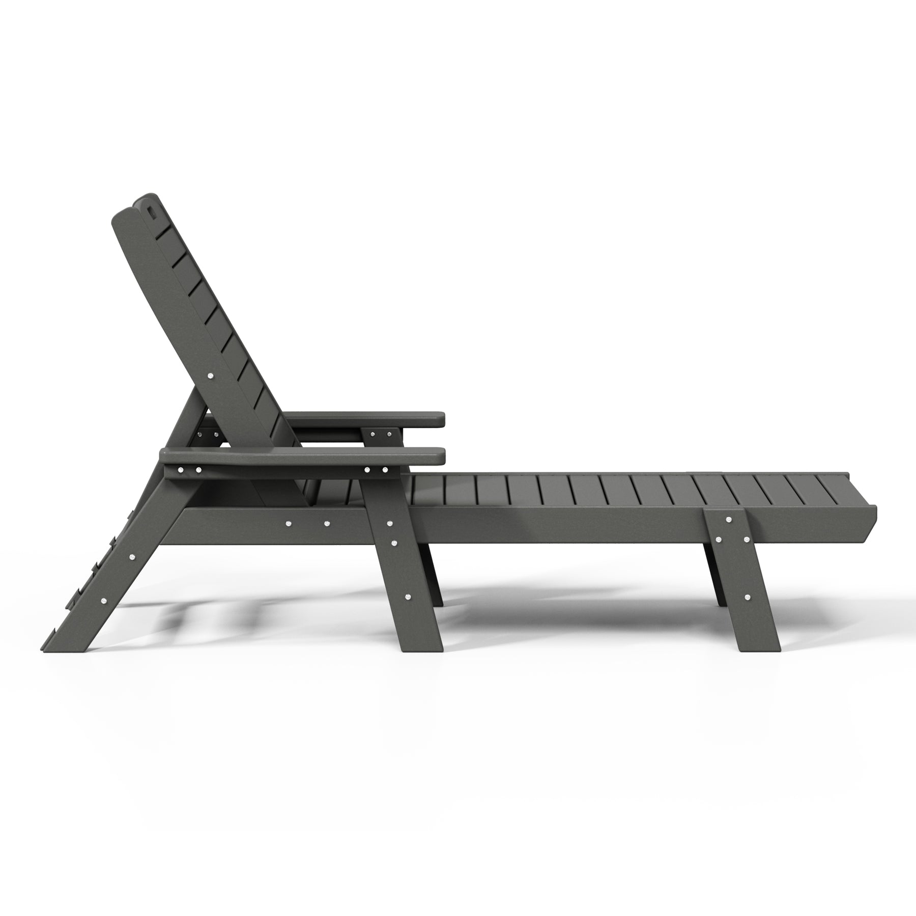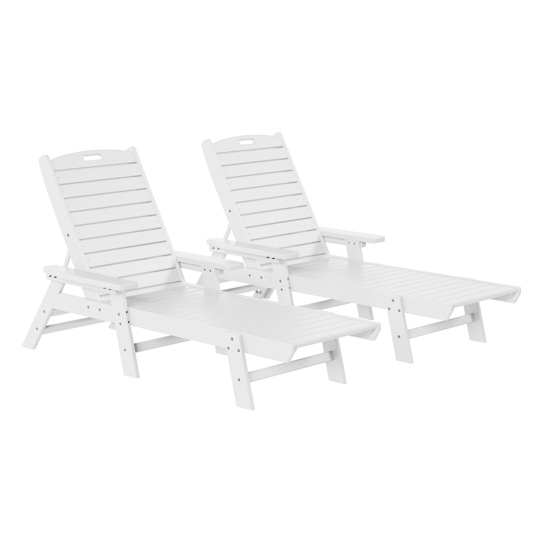 Lay back and soak up the sun near the pool with this beautiful and durable weather-resistant 2-piece reclining chaise lounge chair set. Made with high-quality [HDPE] material, which increases durability and is resistant to UV radiation, water, and the elements of the outdoors. Get the most out of your chaise lounge chairs when lounging in the sun thanks to the reclinable design, which lets you place the chair in any position. The chairs can be folded flat, and the handle in the headrest makes it simple to move the chairs and store them away.