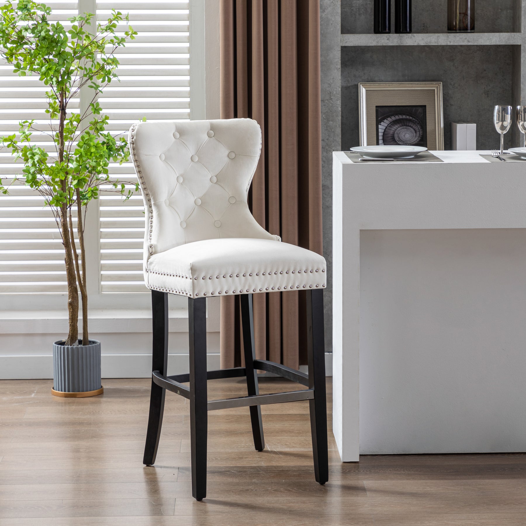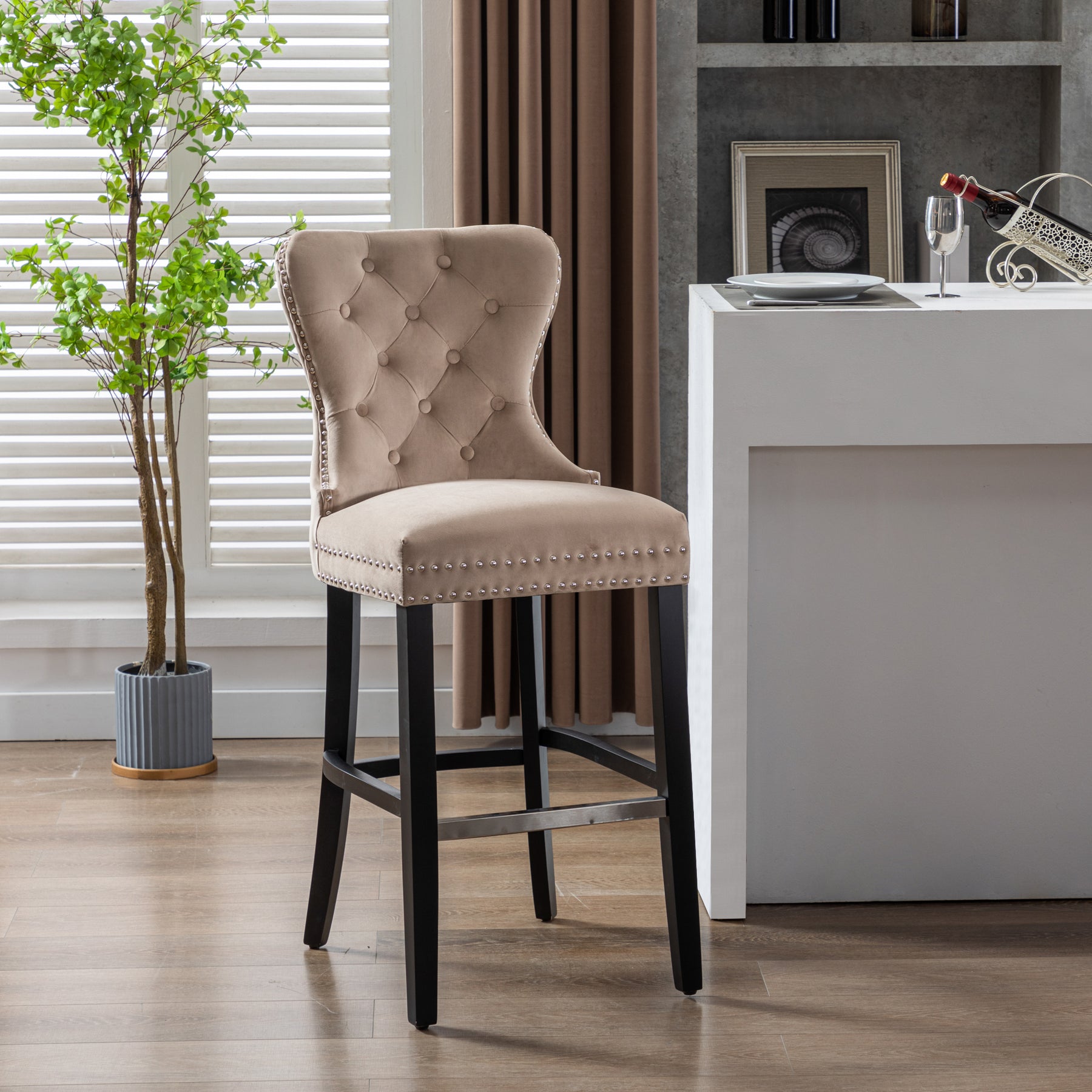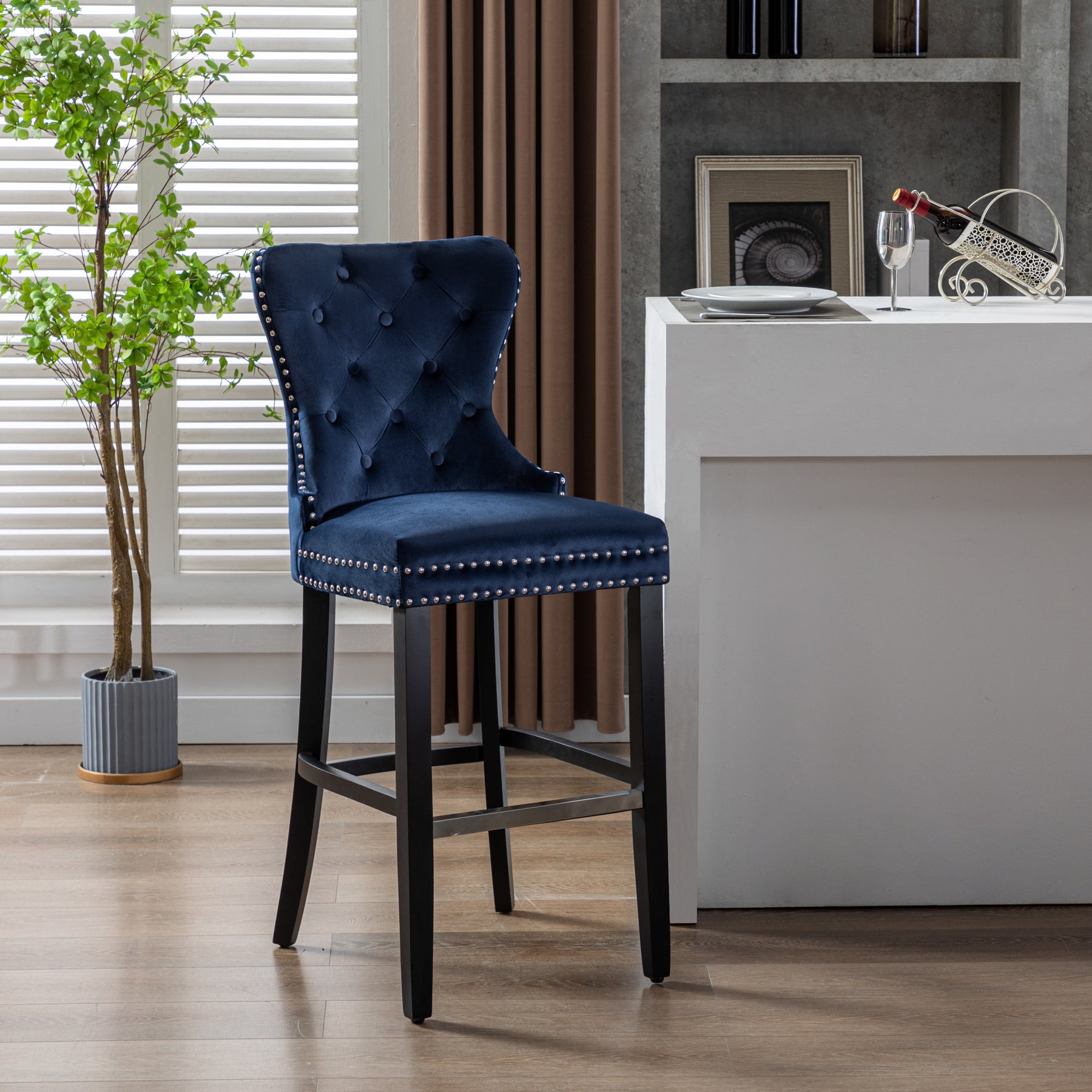 Glam up your bar with a 29" velvet button-tufted stool. The wingback design and dazzling nailhead trim bring beauty and artistic flair to any dining space. For optimum sitting comfort, place your feet on the silver-plated footrest. The sturdy black rubberwood legs make this armless stool durable and comfortable. The ornamental ring will add a touch of style to your unique décor.