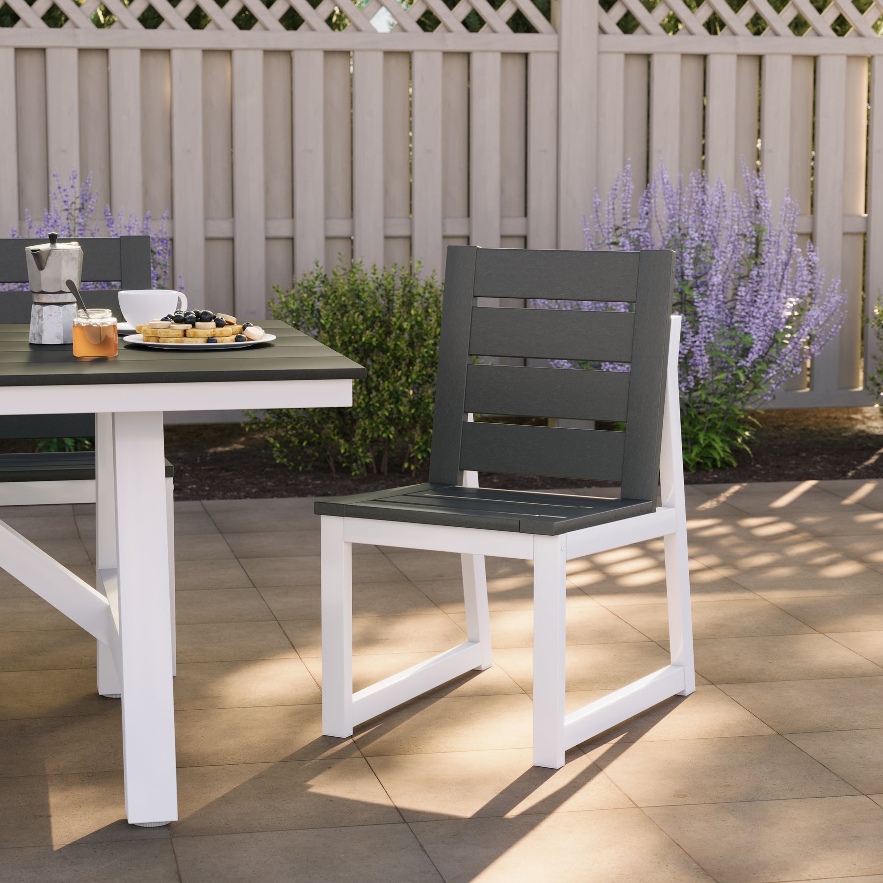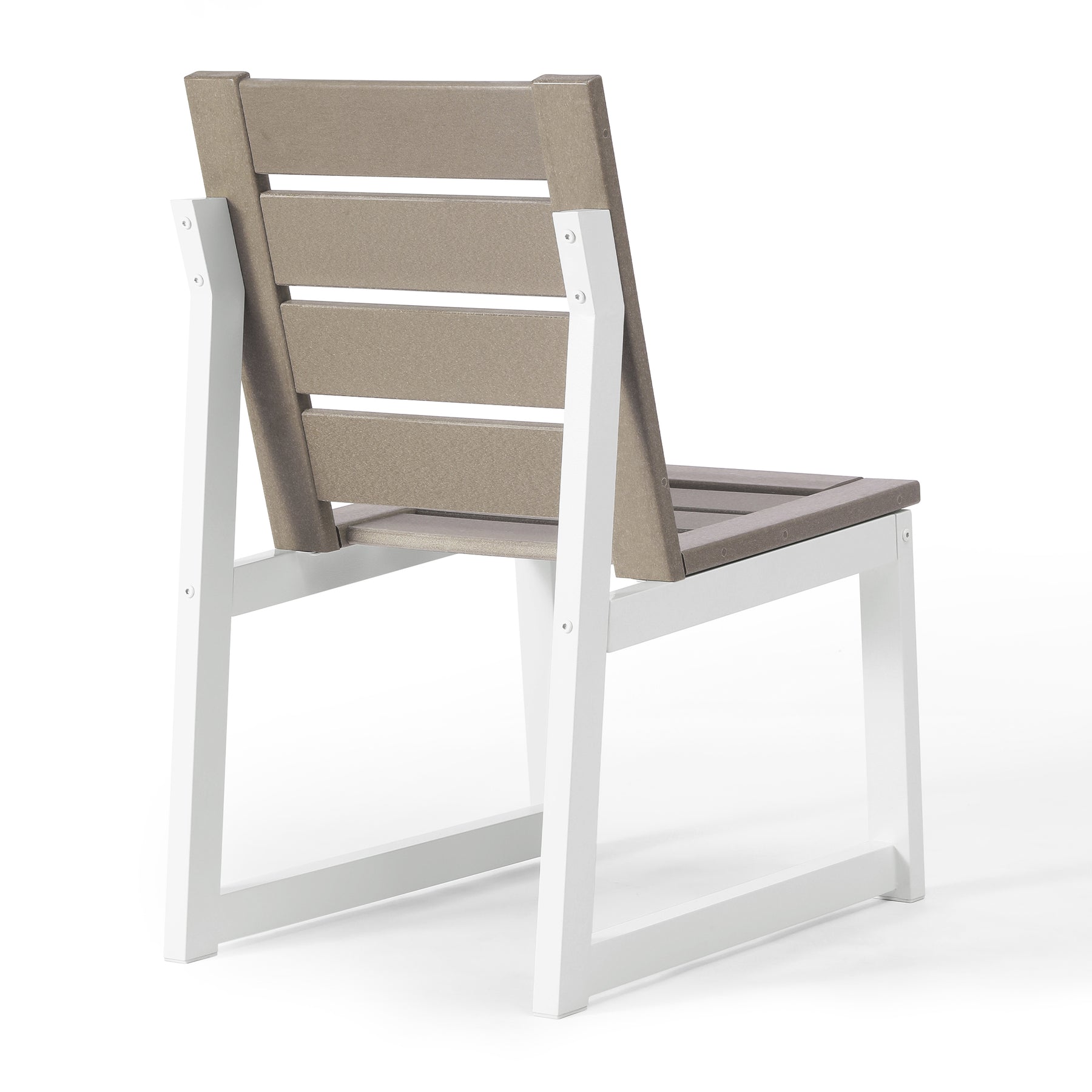 Designed with a modern sensibility and built for lasting outdoor use, this HDPE Outdoor dining chair brings effortless style and comfort to patios, decks, and open-air dining spaces. Its clean lines and contemporary profile pair easily with a variety of tables, making it a natural addition to a thoughtfully curated patio table and chairs set. The seat is crafted from durable HDPE, chosen for its ability to withstand sun, weather, and everyday outdoor use while maintaining its look season after season. A square stainless steel frame provides a strong, balanced foundation with a sleek, architectural feel. Finished in a powder-coated metal, the frame adds an extra layer of protection against rust, fading, and wear, ensuring lasting performance with a polished, modern finish. Designed for comfort as well as style, the slatted seat allows air to circulate, keeping you cooler on warm days. Subtle rubber foot pads help keep the chair steady on a variety of surfaces while protecting both the chair and your outdoor flooring. Durable yet refined, this chair blends seamlessly with other HDPE patio chairs to create an inviting outdoor dining experience suited for both residential and hospitality settings.