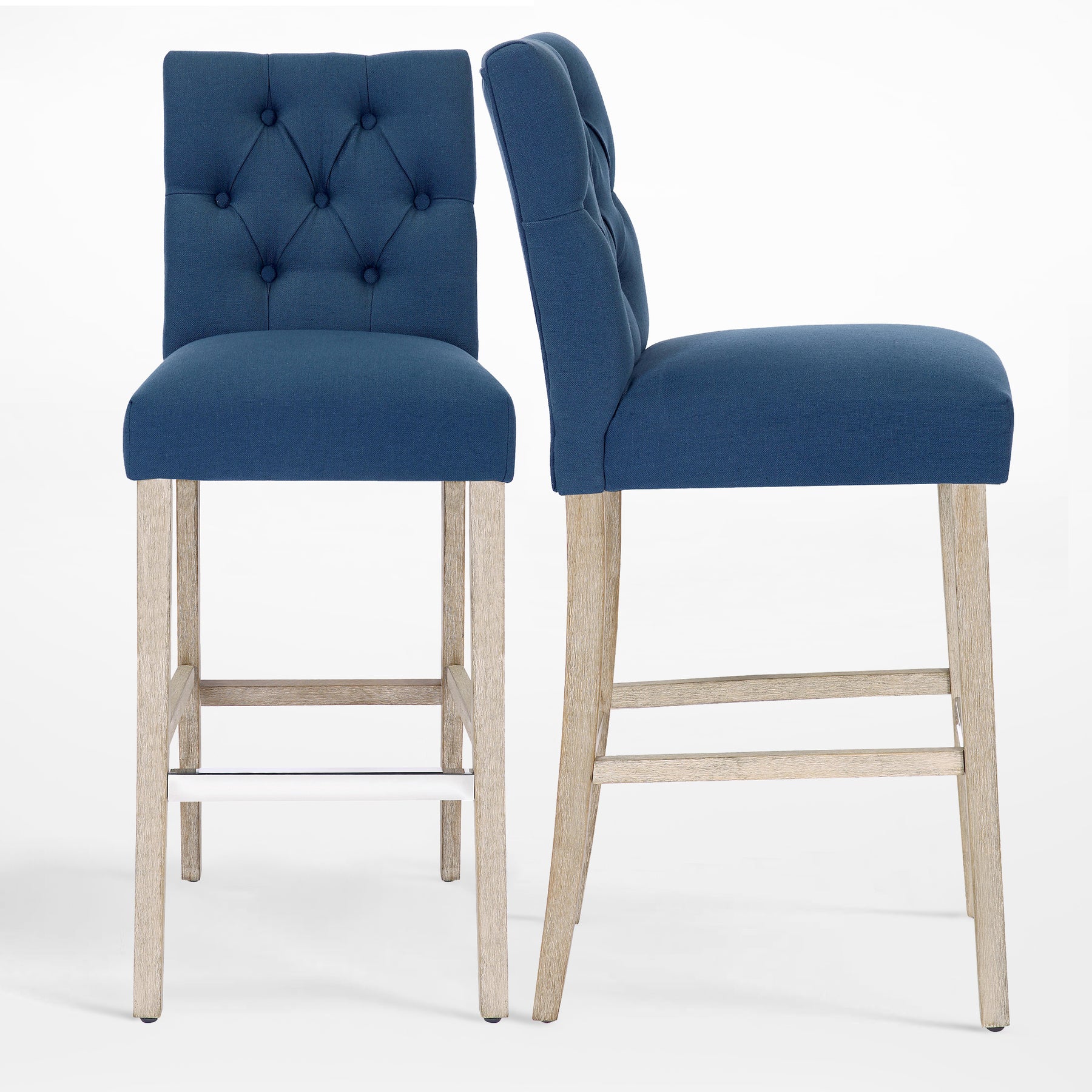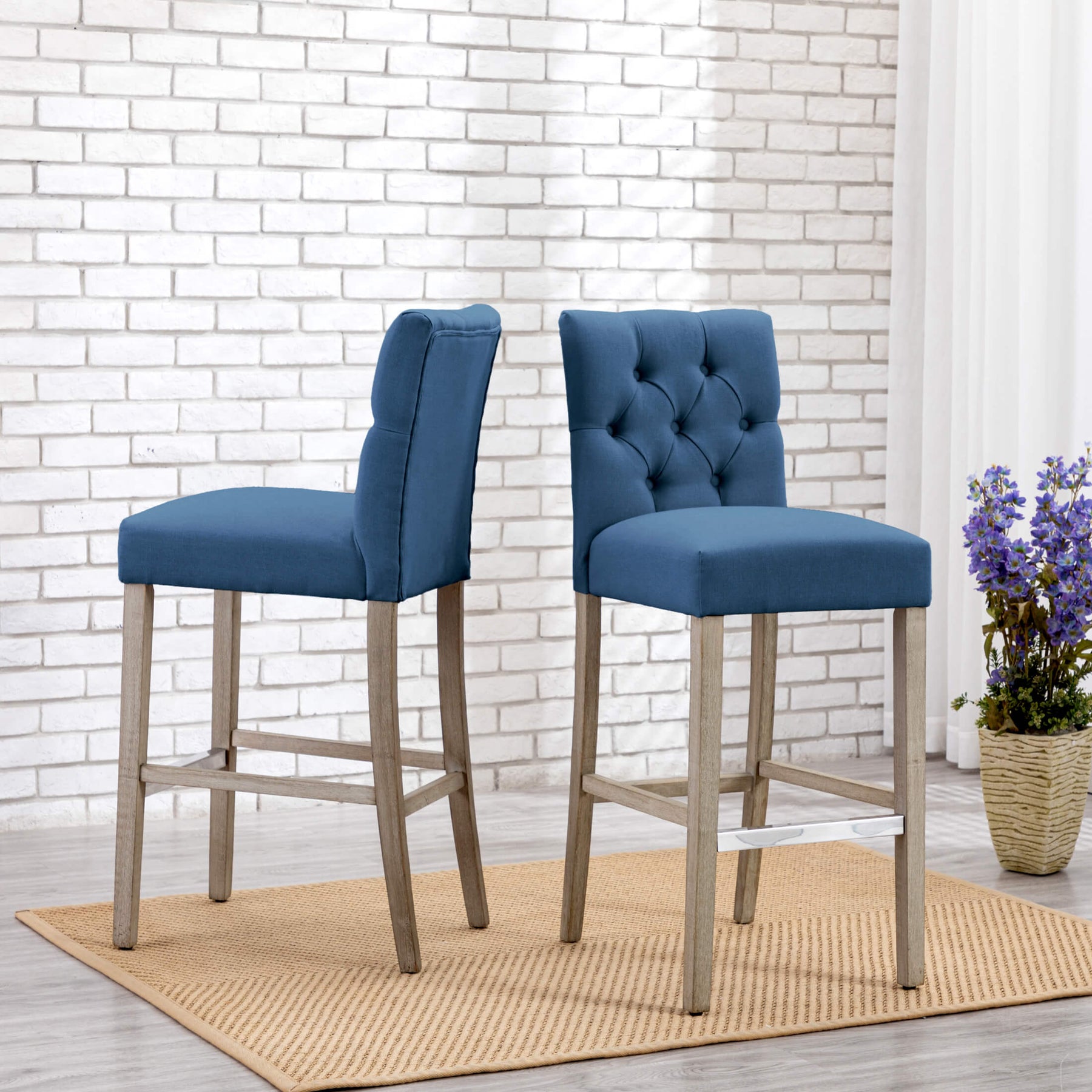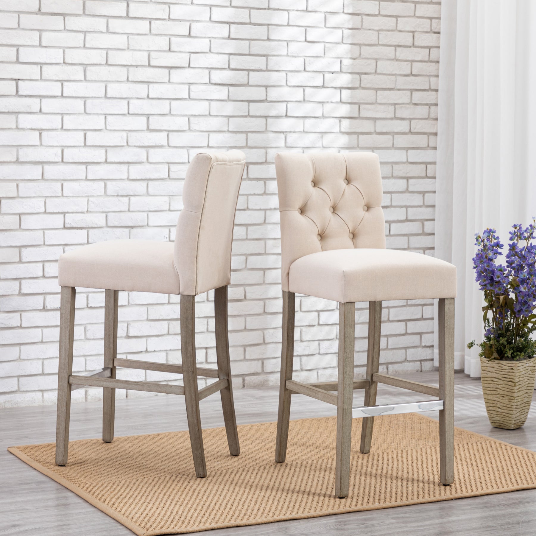 The perfect choice for your kitchen island, these bar stools add classic style with a diamond button-tufted back and solid wood legs. With dense foam padding, sinuous spring support, and soft fabric upholstery, they are the perfect stools for relaxing in comfort. The back and seat are wrapped in soft poly/linen fabric, while the optional silver metal footrest adds a contemporary touch and protects against scuffs and scratches.
