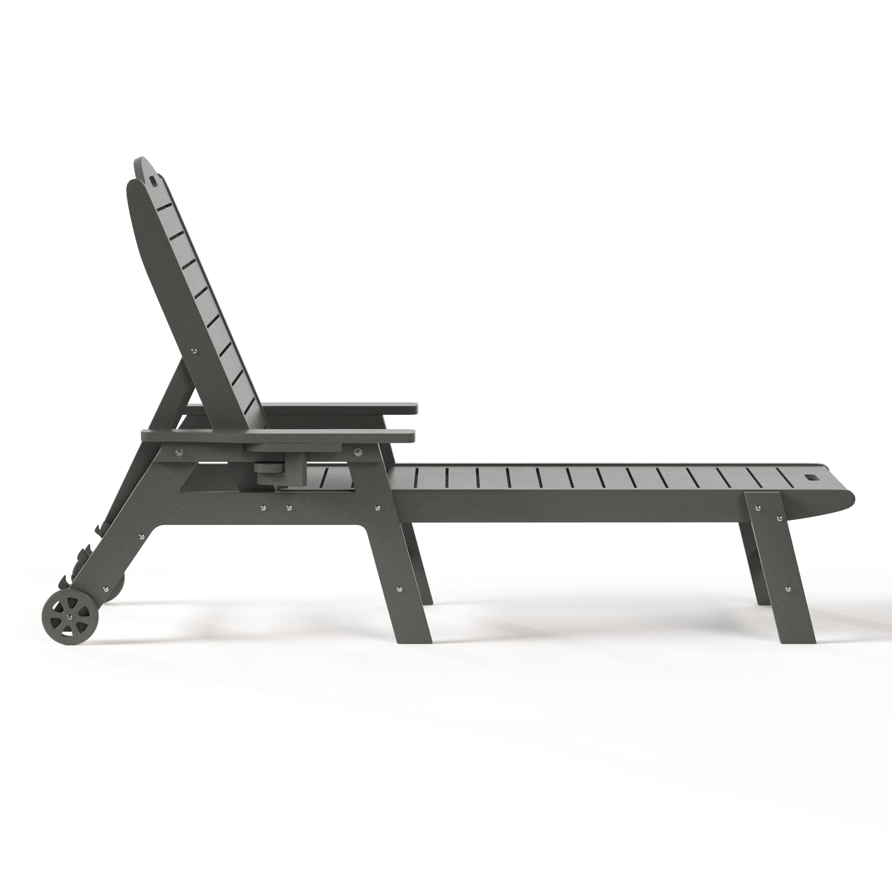 Transform your outdoor retreat with our 2-Piece Outdoor HDPE Patio Chaise Lounge With Wheels & Cup Holder & Matching Patio Side Table. Thoughtfully crafted from durable, weather-resistant HDPE, this set is designed to st& up to sun, rain, & humidity without fading, cracking, or peeling. The chaise lounge features a 5-position adjustable backrest, including a fully flat recline, for personalized comfort whether you’re reading, lounging, or sunbathing. A discreet, retractable 3" cup holder keeps your drink within reach, while smooth rear wheels make repositioning effortless. The coordinating Adirondack side table adds balance & function with its slatted tabletop, sturdy two-tier construction, & reinforced H-frame for enhanced stability. Perfectly suited for poolside relaxation, the patio, or a serene garden corner, this weatherproof, low-maintenance set combines enduring durability with a clean, modern aesthetic that elevates any outdoor space.