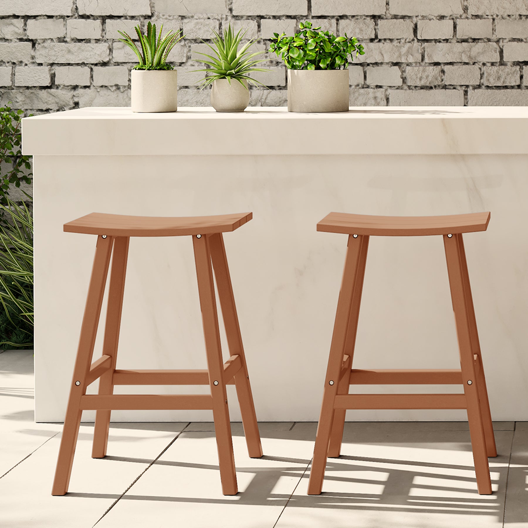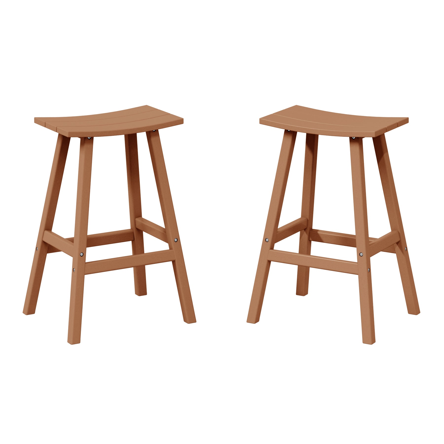 Comfort and style combined into this 2-piece 29" saddle bar stool. The stool features solid HDPE construction that is made for daily outdoor use. UV and weather-resistant materials help keep its vibrant shine for many years of use. This outdoor bar stool is a great way to add convenient seating to the kitchen, home bar, den, outdoor patio and more. This set of bar stools is designed to add a classic style to your home or outdoor living space. Combines perfectly with other Adirondack style furniture to help complete your outdoor set up. Saddle slatted seats will bring an elegant and comfortable style to any patio bar area. The UV and weather resistant material make them able to last from season to season. fade-resistant to help keep its true color. Comfortable footrest and wide seating. A classic Adirondack Backless Barstools provide stylish comfort that is perfect for your backyard bar or lounge. Available in easy to match colors. Slide them up to a Patio bar or use at a kitchen counter.