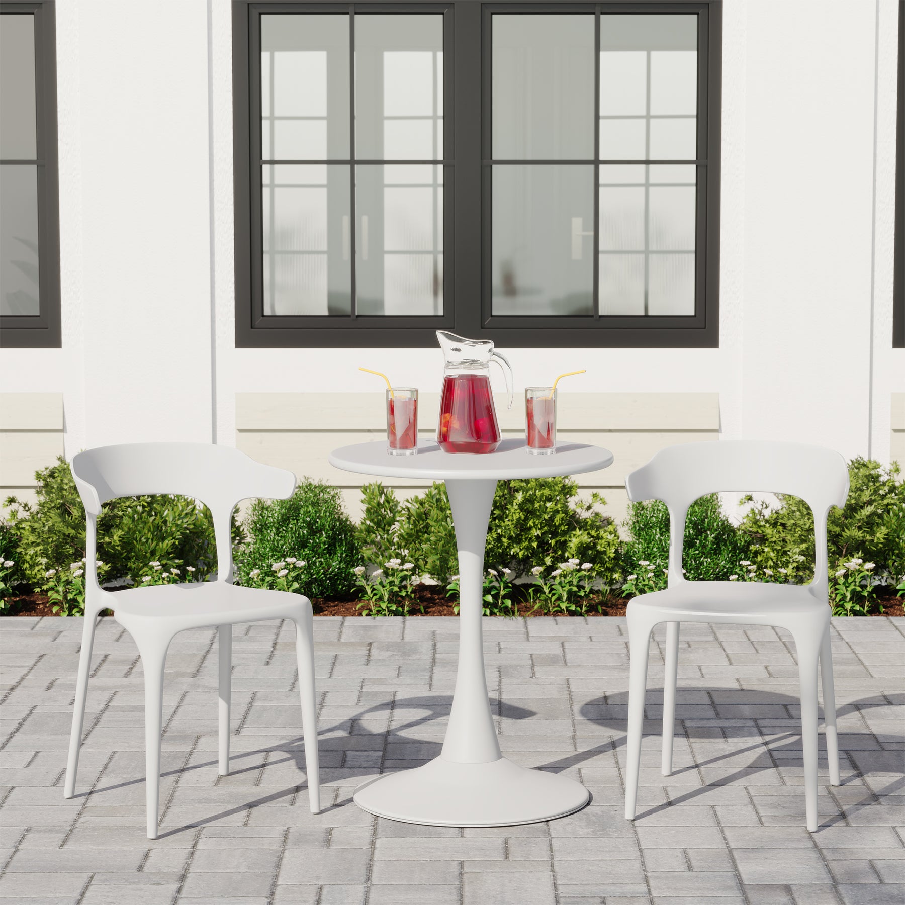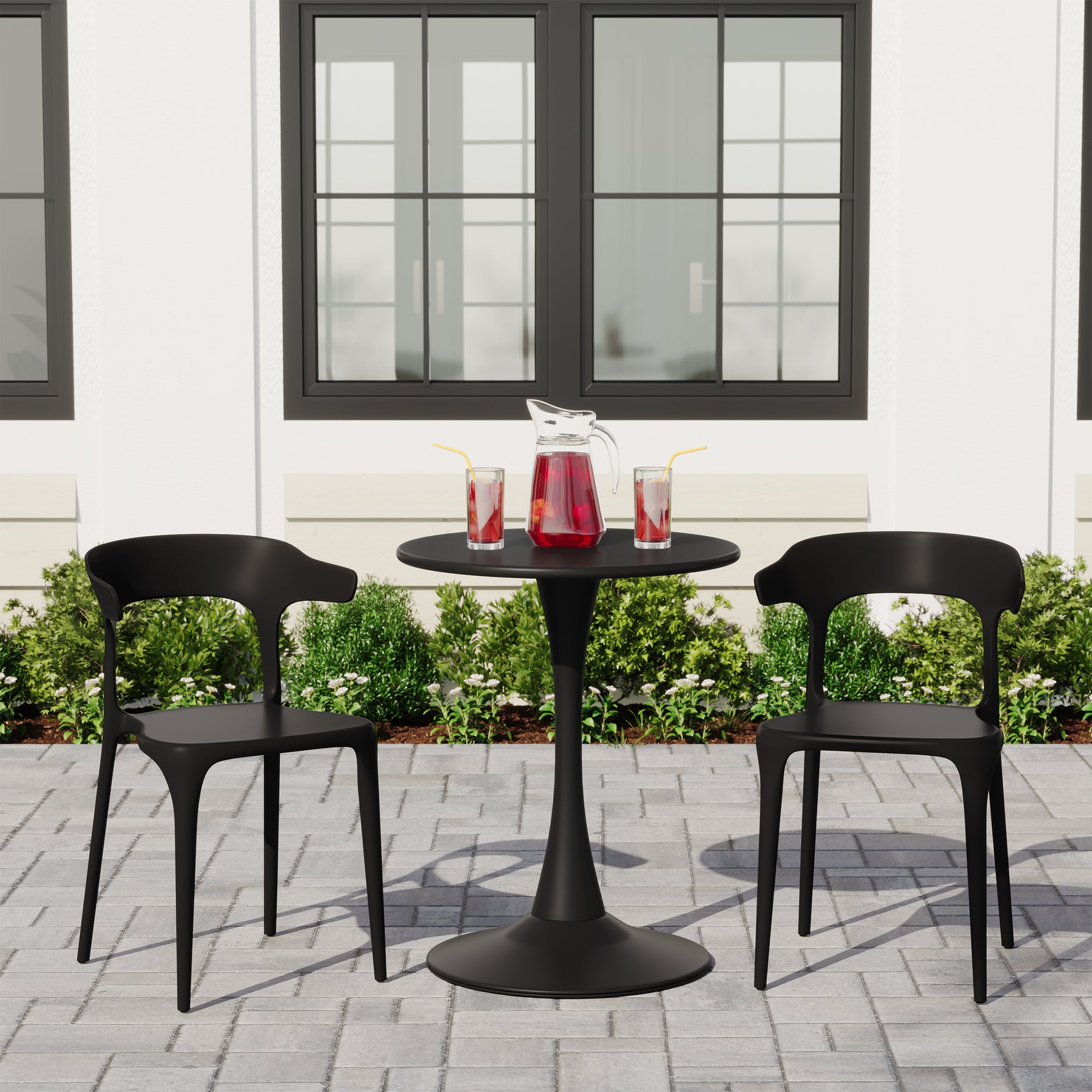 Elevate your outdoor gatherings with this two person dining table set. The round bistro dining table, crafted from a durable metal material has a rust-resistant e-coating that ensures the tables longevity and has a wide flat base to reduce wobbling and promotes stability. Complementing the table are two stackable patio chairs, designed for space-conscious living. Made from UV-resistant polypropylene resin, these lightweight chairs allow for effortless rearrangement, adapting to your evolving patio aesthetic. The patio dining chairs are designed with a wide curved backrest offering a more comfortable design and the open backrest promotes better airflow to keep you cool during the warmer days. Enjoy instant gratification with the fully assembled chairs, while the table's assembly allows for quick setup, making it the perfect centerpiece for your outdoor retreat ensuring this 3-piece round patio dining table set for 2 is the perfect set for your patio this season.