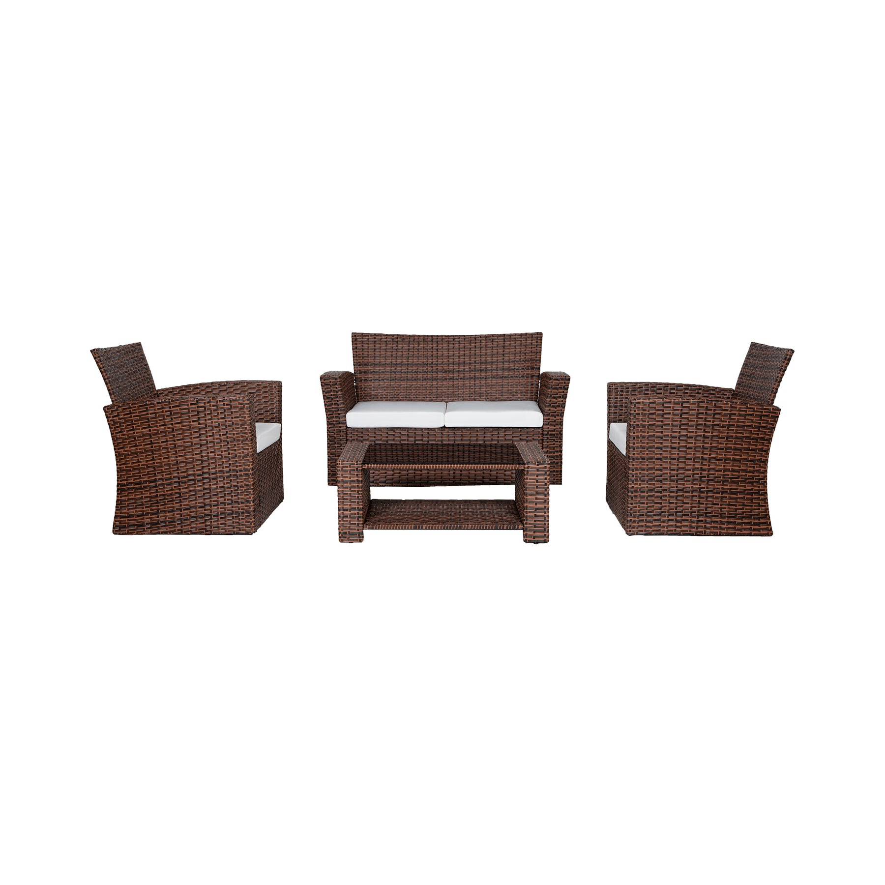 Lounging by the pool, patio, or balcony, no matter where you are, this patio set is sure to be the center piece for your outdoor living space. Each piece is designed with a sturdy steel and rattan wicker frame that can withstand even the worst weather, from windy rain to all-day sunshine. With comfortable cushions, you can spend hours chatting with friends or family while placing your drinks and snacks on the tempered glass coffee table. This cozy 4-piece set is certain to be the gathering of parties and the ideal addition to any outdoor living space.