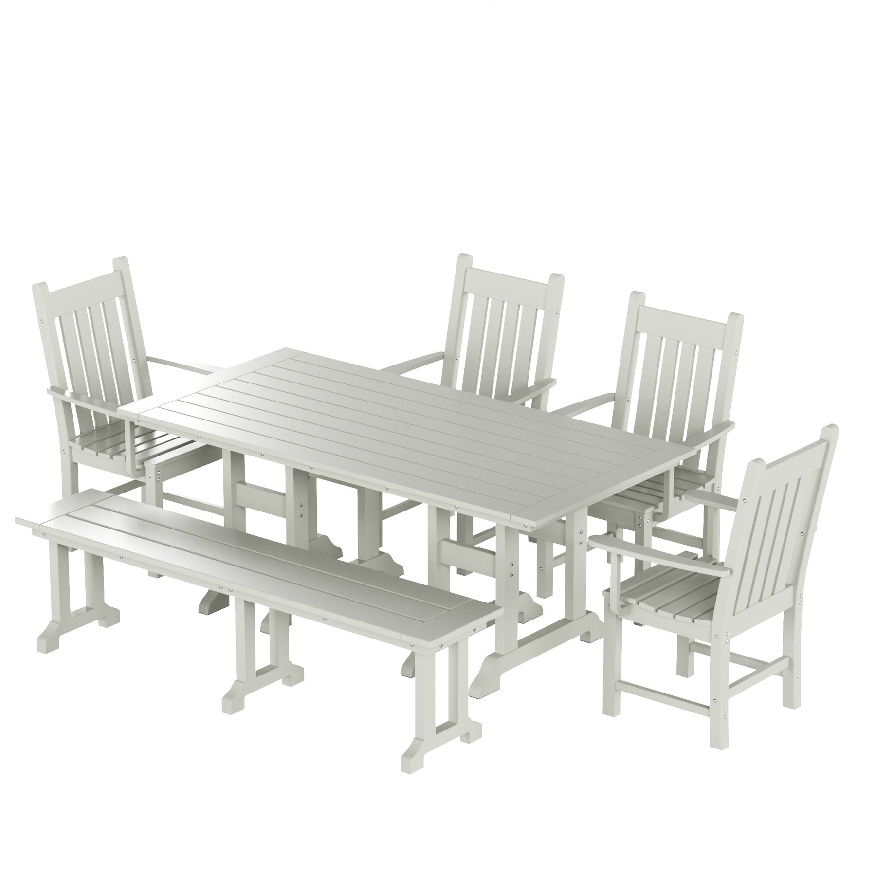 • Set includes: One (1) Rectangle Table, One (1) Dining Bench, Four (4) Dining Armchair