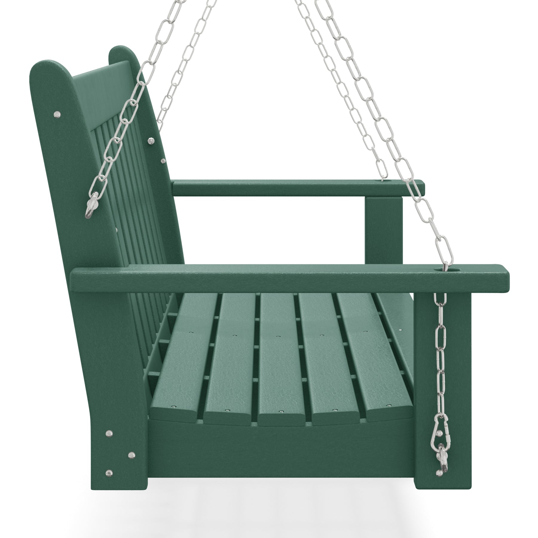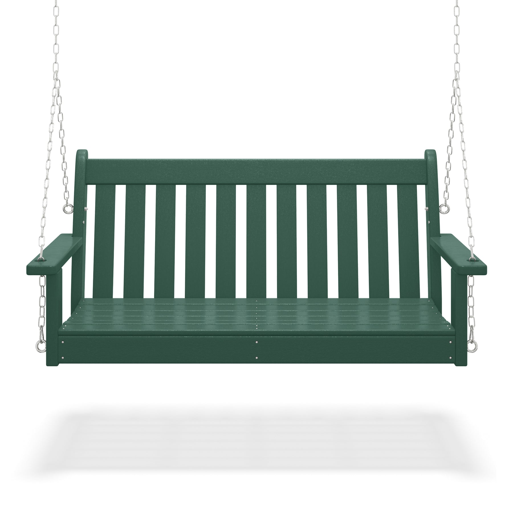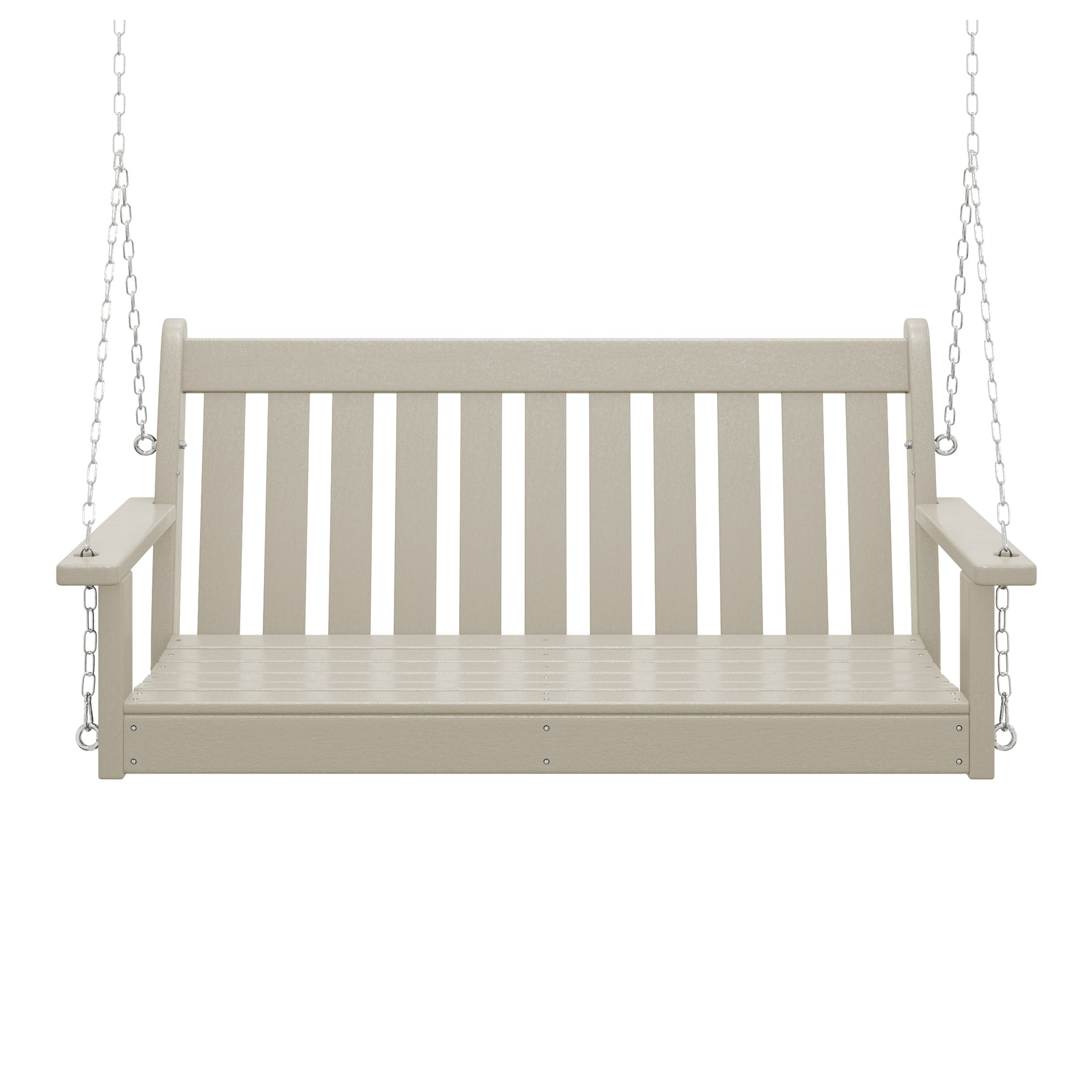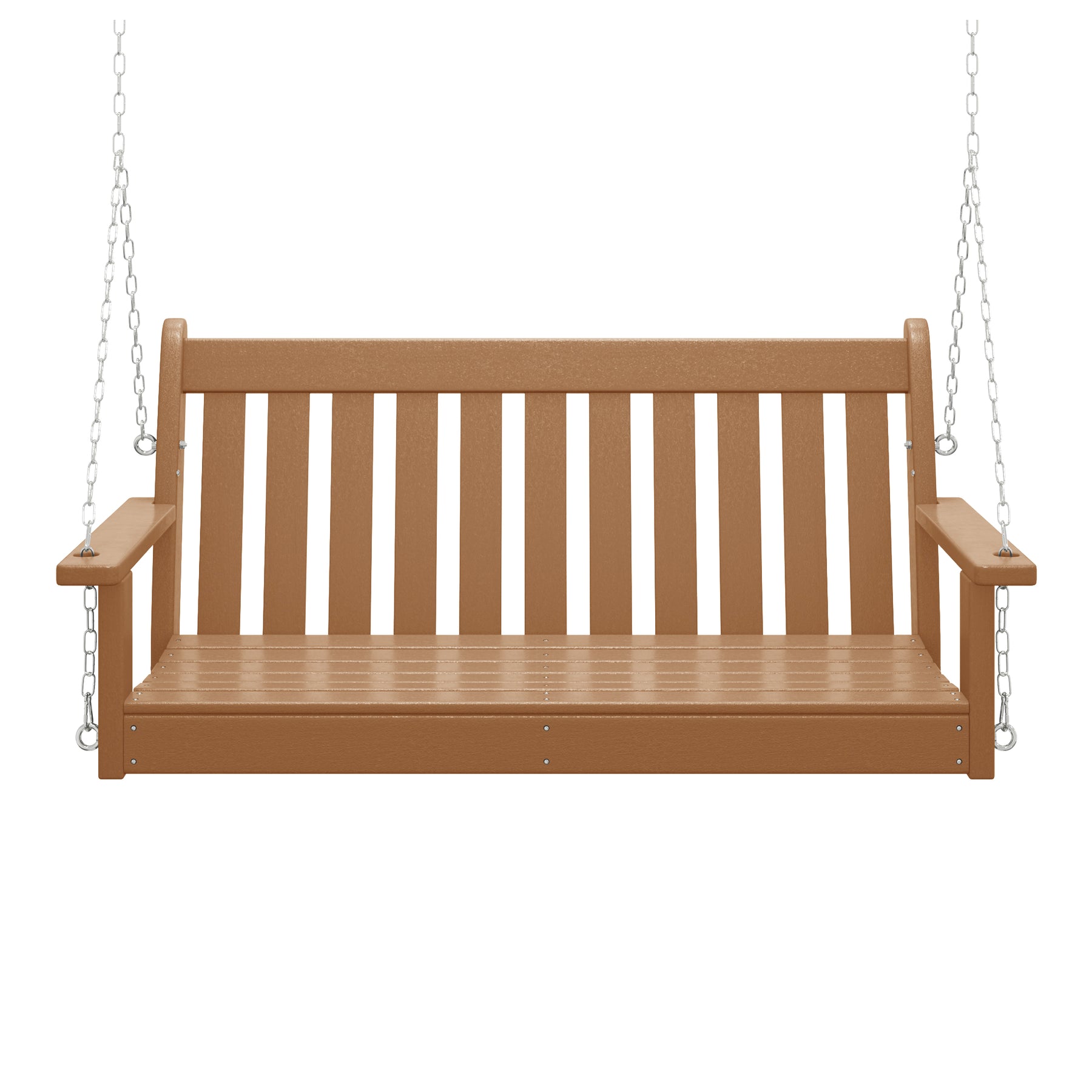 Relax on our charming 50-inch wide outdoor HDPE porch swing bench on the porch this season while watching the sunset or reading a good book and relaxing. Made from durable HDPE that is UV and fade-resistant, it keeps its charming color season after season. Comfortable and charming with the contoured seat and the traditional farmhouse style, it adds charm to your front porch or garden area.