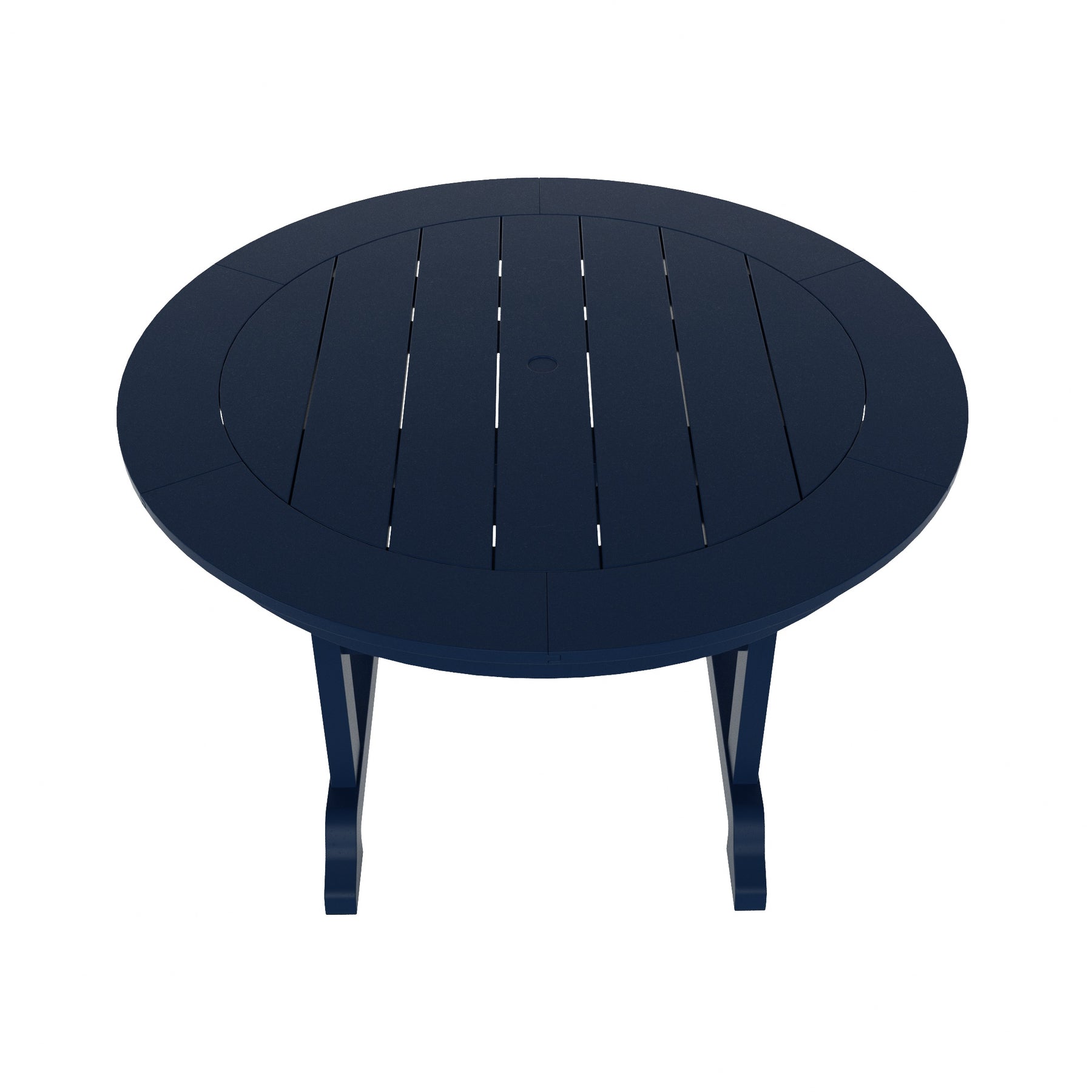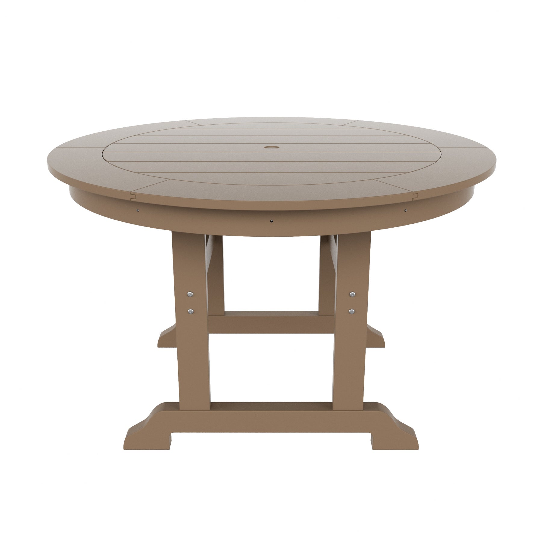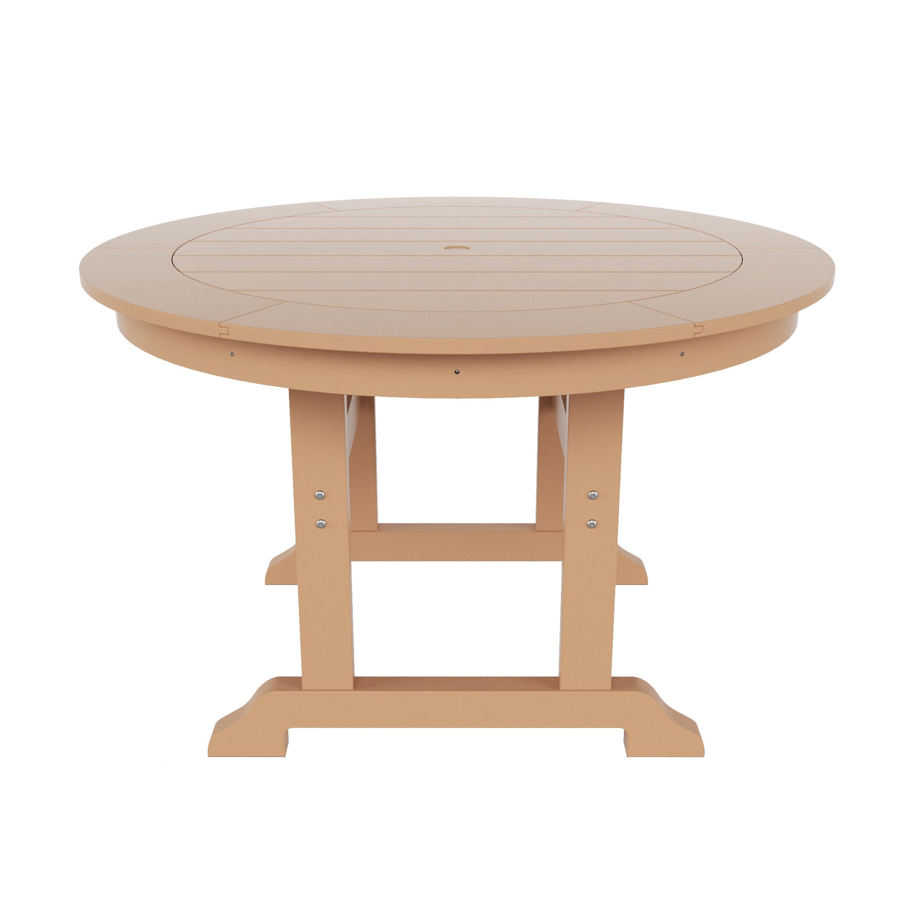 This 47" outdoor dining table is sure to complete your patio or backyard and match with your outdoor dining chairs. Created with eco-friendly HDPE material adds durability and can withstand the outdoor elements thanks to the HDPE's natural UV and weather resistant. The table is made to look like natural wood without any of the disadvantages of natural wood, meaning that this table isn't prone to splinters, cracks, or peeling. The 1.97" center hole is perfect for standard umbrellas. This table is perfect for the outdoors and will have your home looking great with the semi-gloss finish that is sure to shine.
