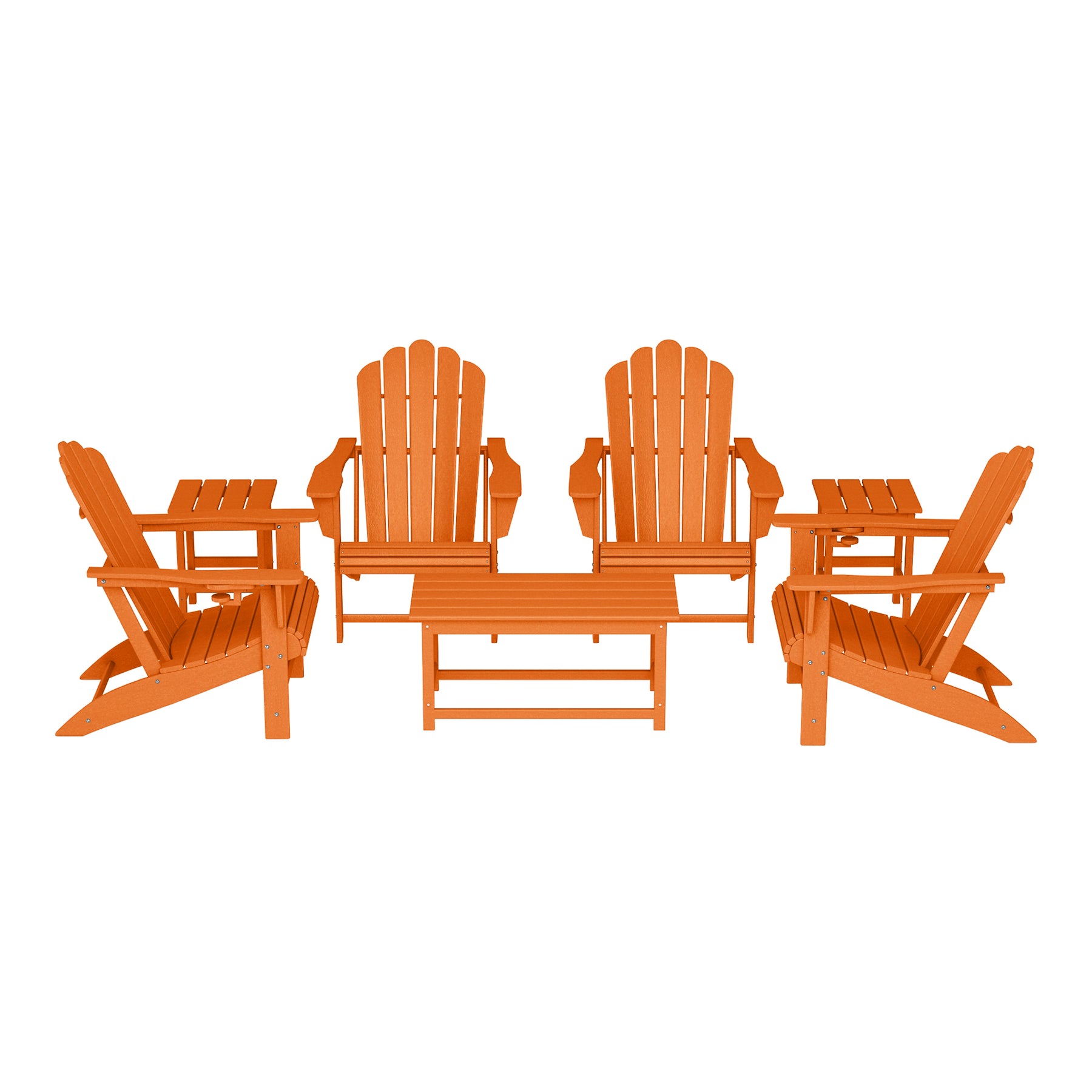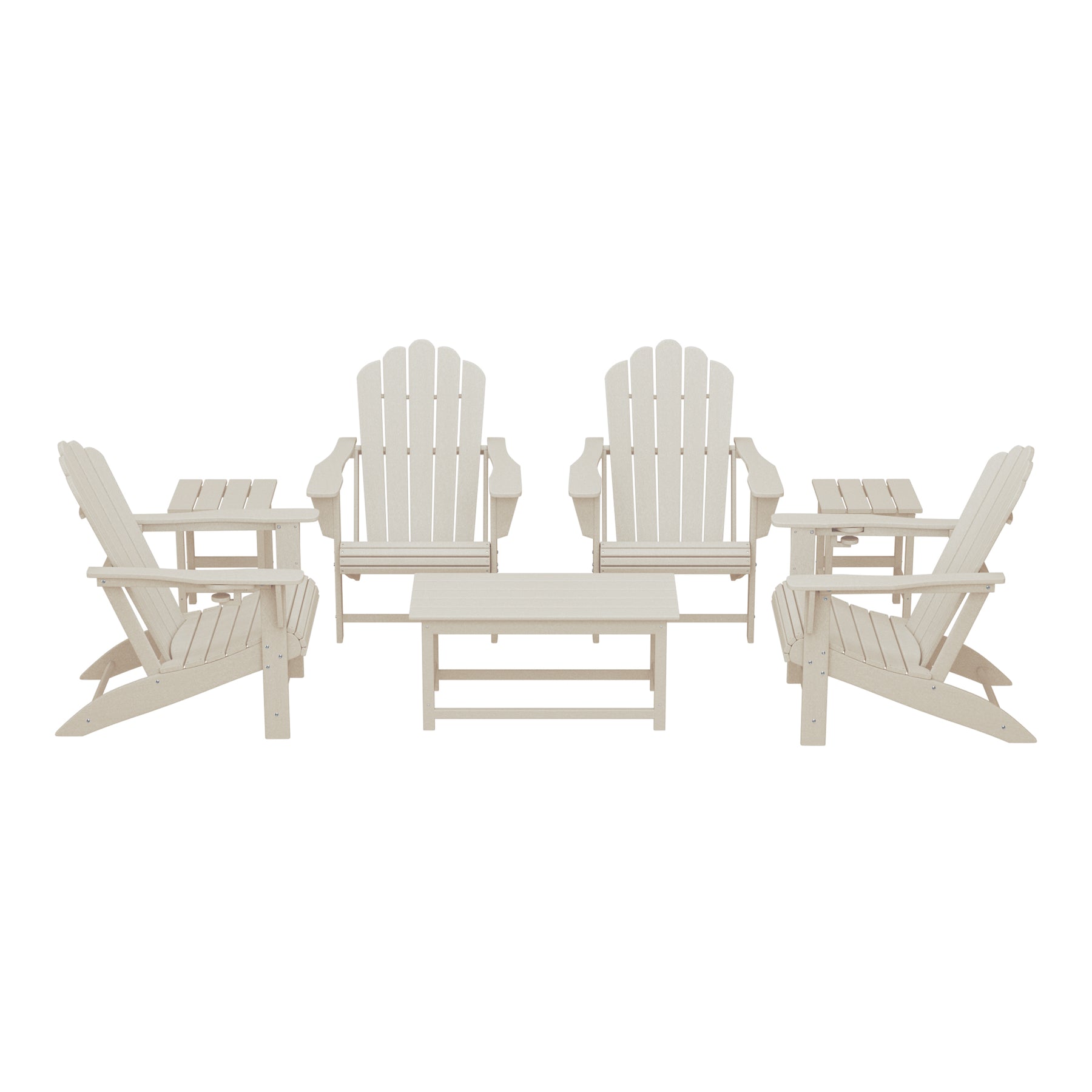 Relax in style with our 7-piece Adirondack chairs with cup holder and table set for ultimate convenience. Crafted from durable, weather-resistant, UV and fade-resistant HDPE, designed to withstand the elements and provide lasting comfort. The contoured seat with the waterfall and backrest offer optimal support, while the hidden cup holder keeps your drink within reach and the helpful patio coffee table and side table that can hold extra drinks or snacks.