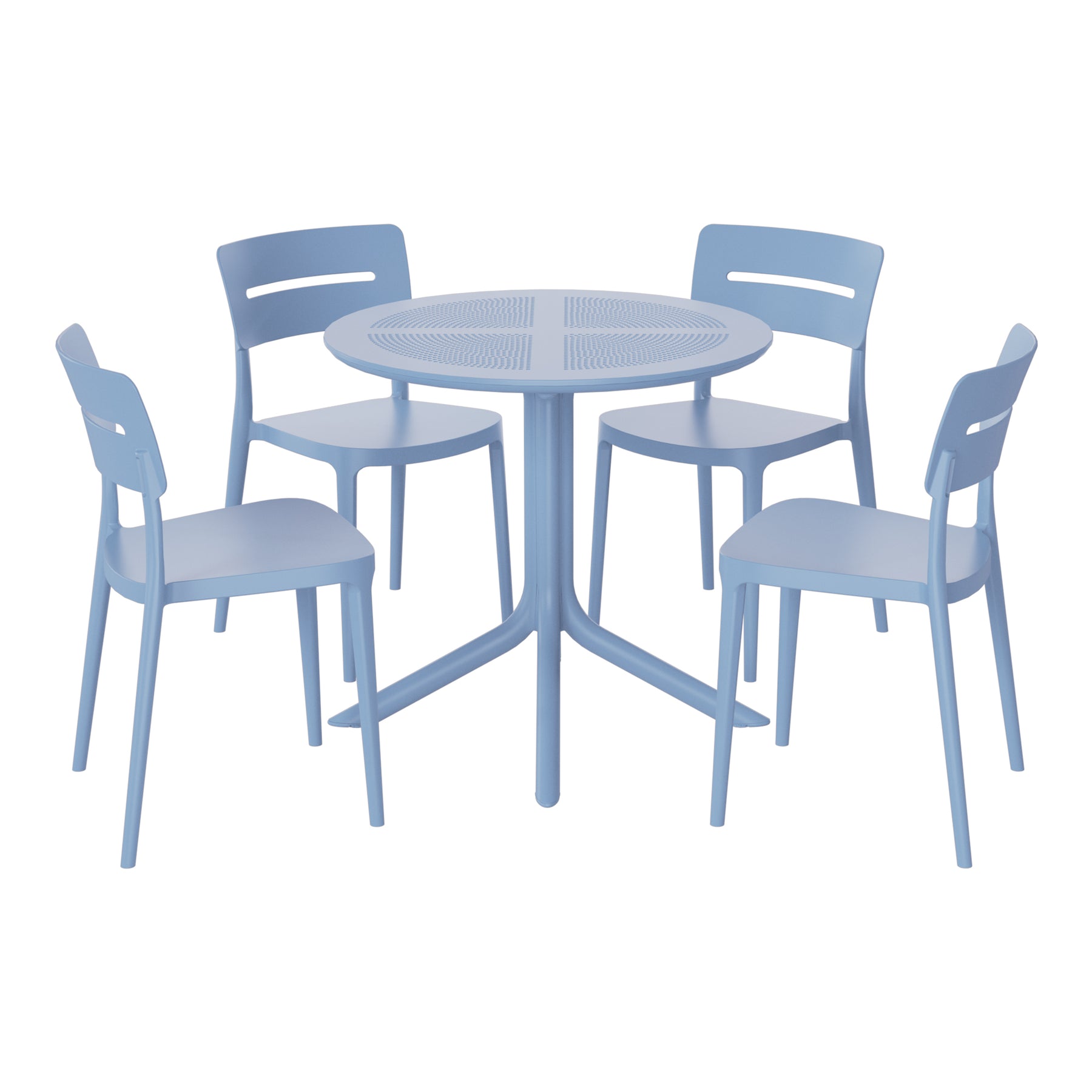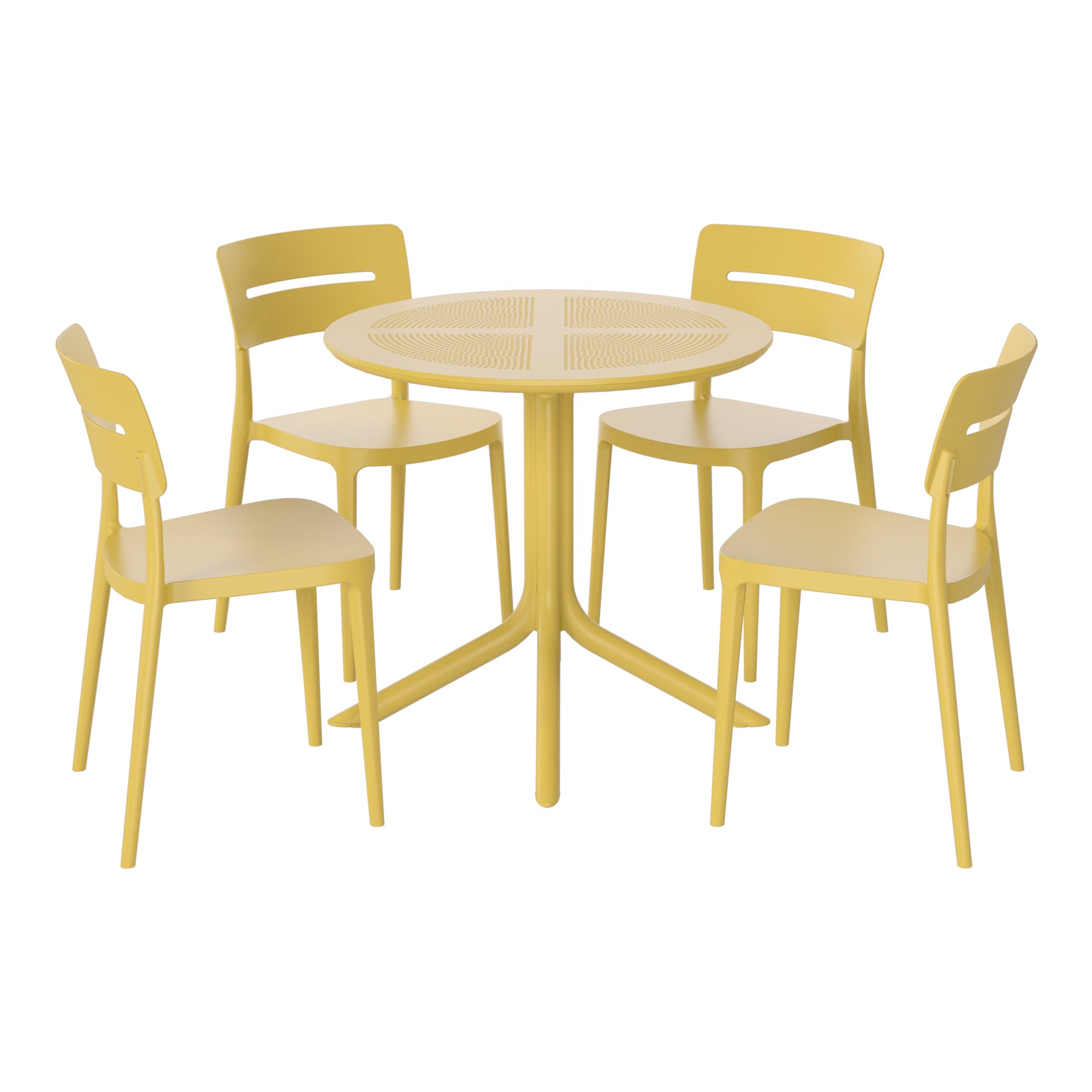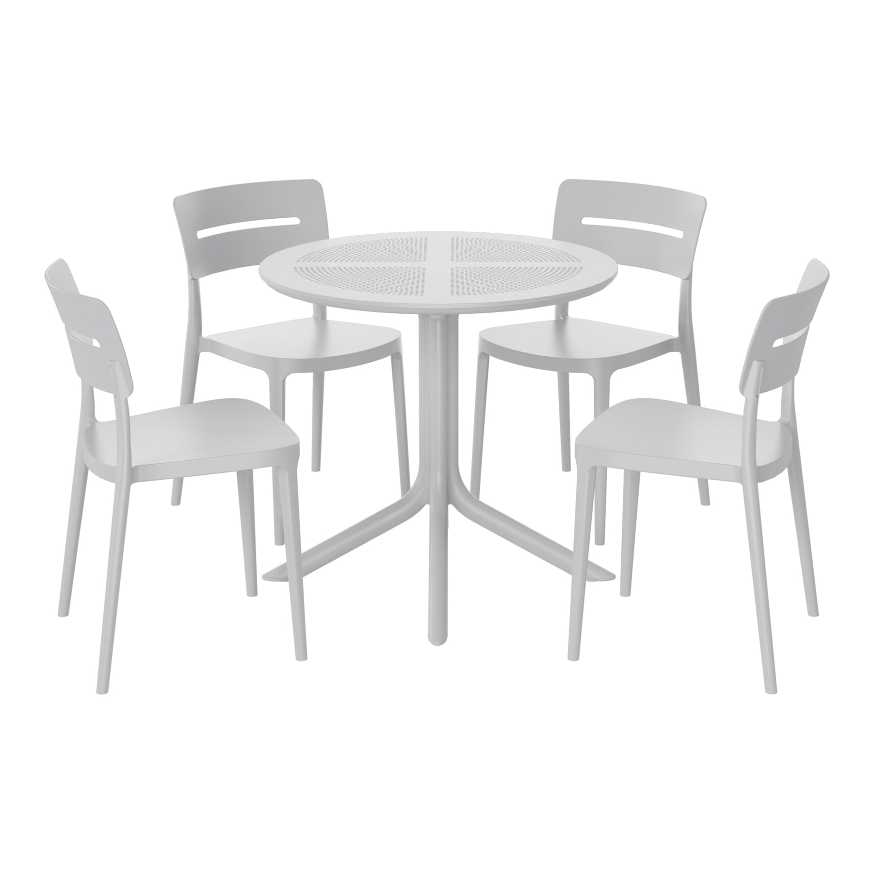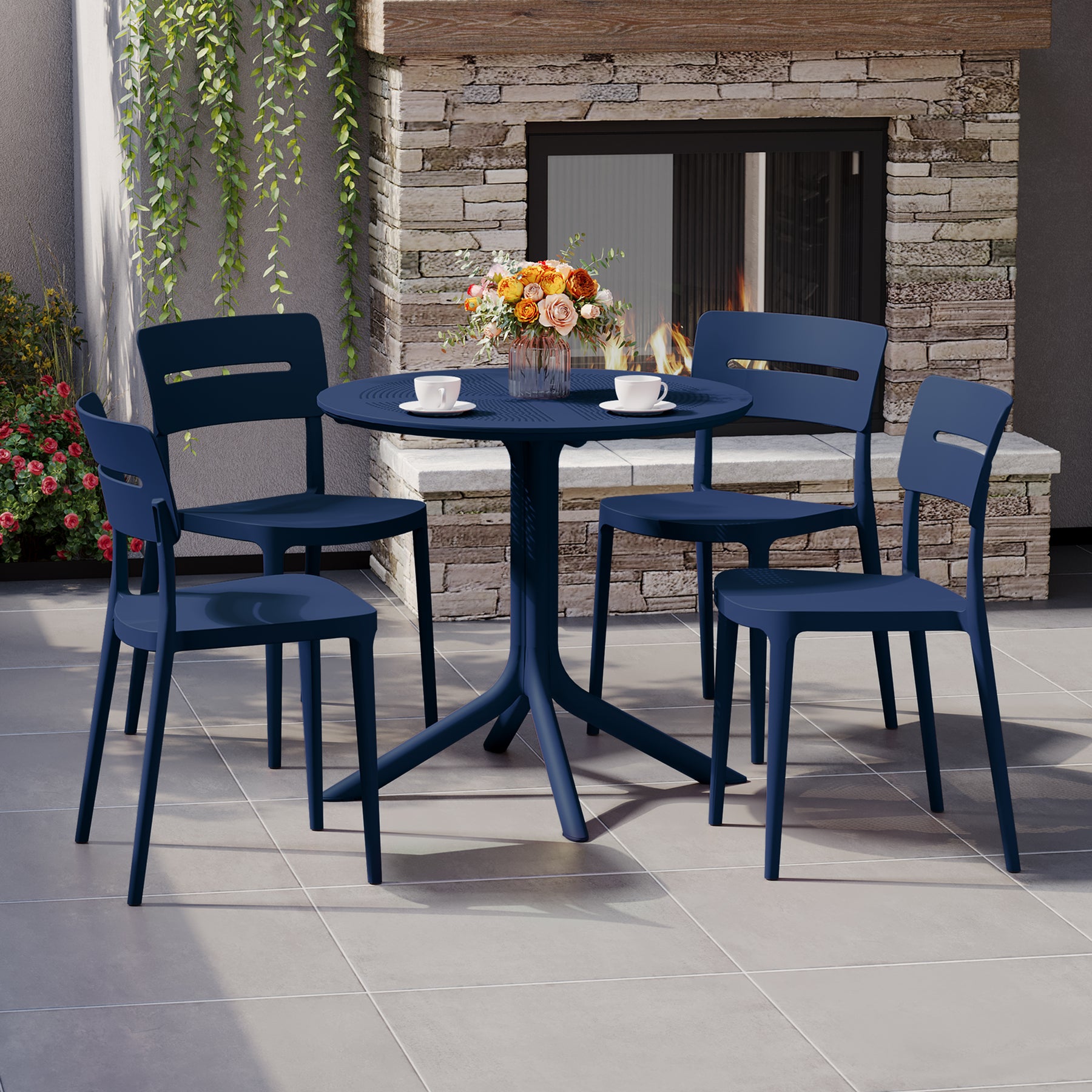Gather with friends or family for a quick brunch on your balcony with our outdoor 5-piece round dining table set with stackable resin dining chairs. Crafted from durable, all-weather PP resin, prepared to withstand the elements while retaining their vibrant color year-round thanks to their UV and fade-resistant properties. Lightweight and simple to move, they are perfect for creating a flexible dining area on even the smallest balconies or patios. Designed with comfort in mind, featuring a open backrest to keep you cool on warm summer evenings, adjustable foot levelers on the patio table to help prevent wobbling and a ventilated tabletop that allows water to drain through and dry the table faster by improving airflow. And when not in use, the patio dining chairs stack neatly for easy storage.