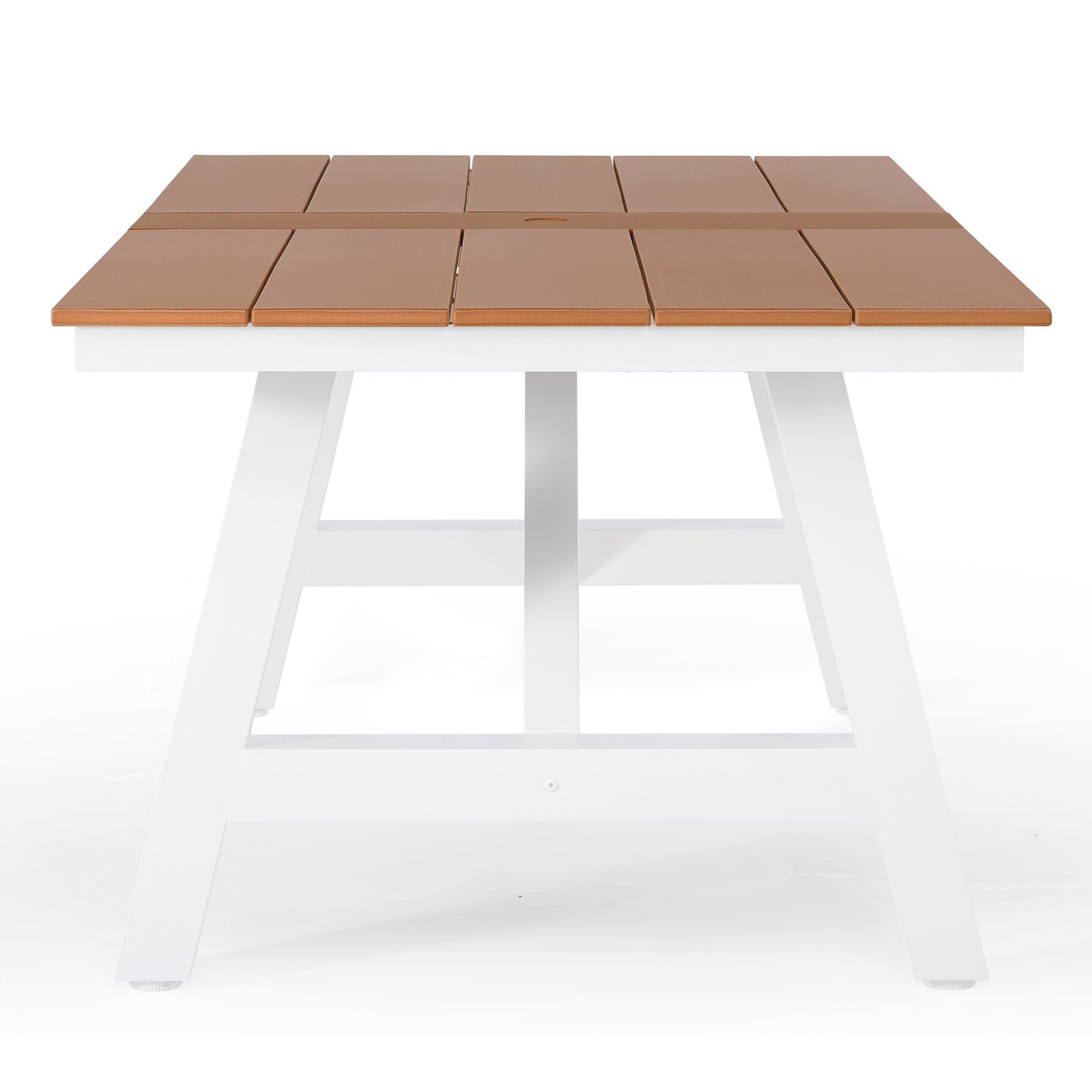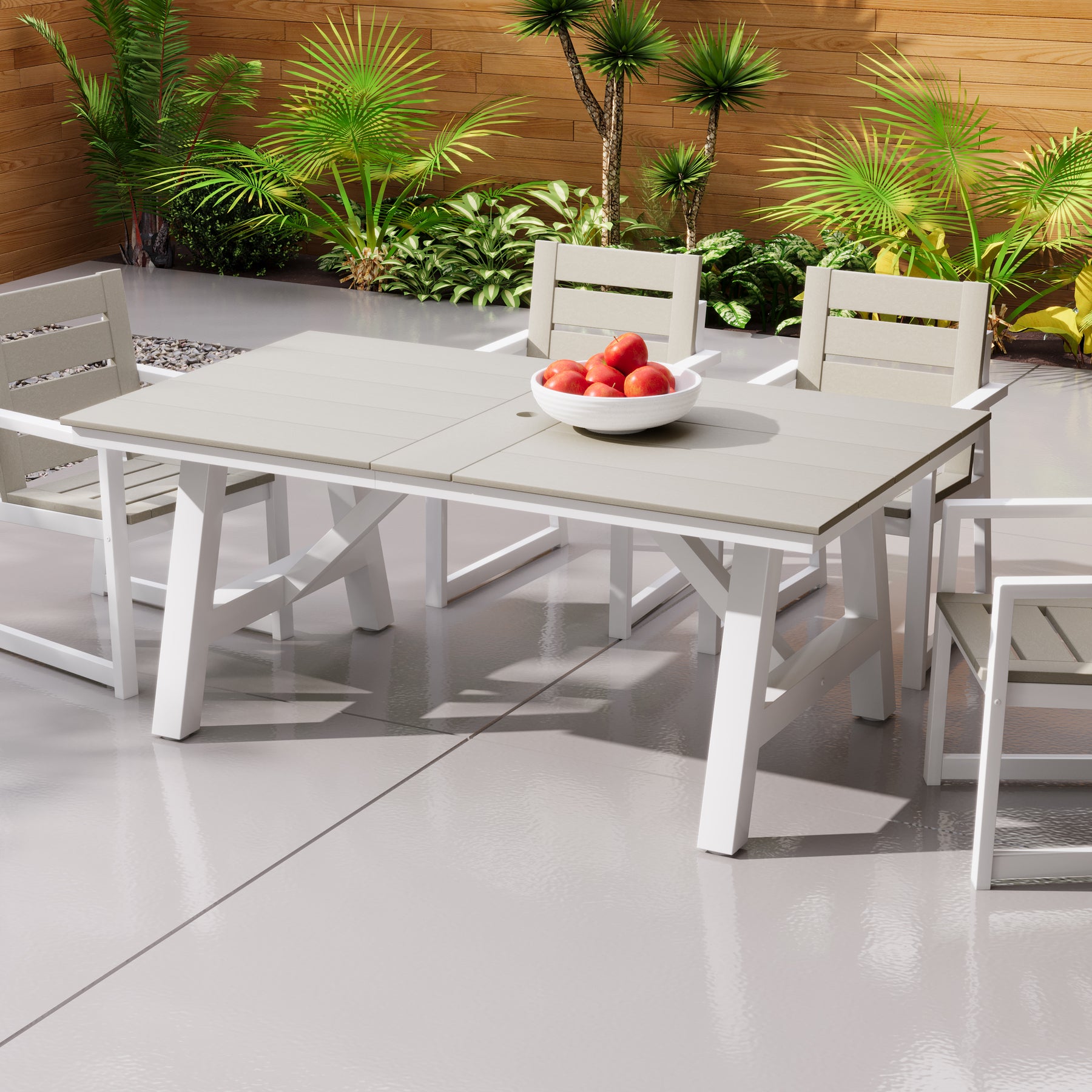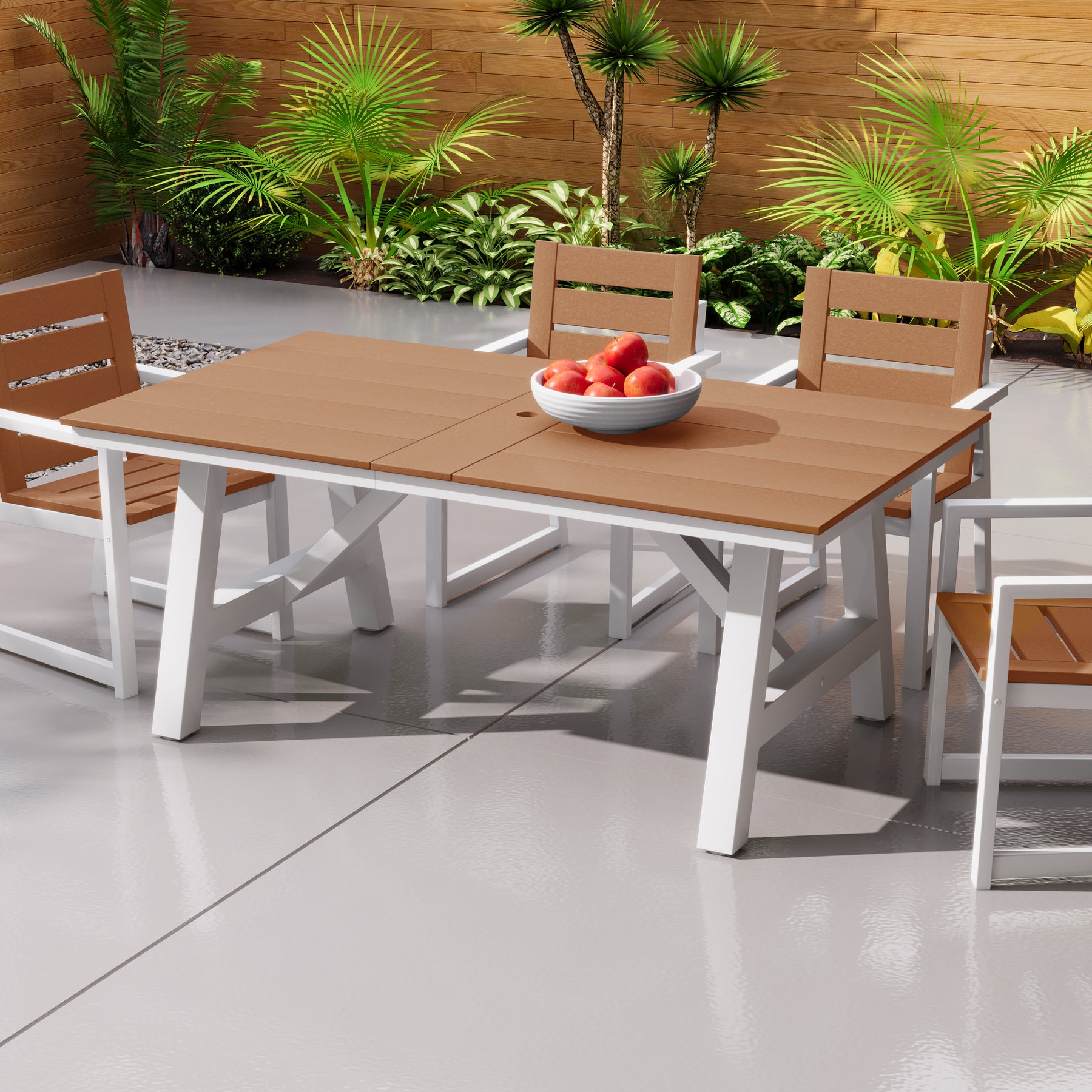Ideal for hosting and everyday outdoor dining, this 72-inch HDPE patio dining table comfortably seats up to six people, making it a perfect choice for an outdoor dining set for 6. Its spacious rectangular design offers ample room for meals, conversation, and gatherings, fitting seamlessly into patios, decks, and open-air dining spaces. Constructed from high-quality HDPE, this table is built to withstand fading, weather exposure, and UV rays, ensuring reliable performance season after season. The sturdy powder-coated stainless steel frame with reinforced support beams provides dependable strength and stability, while the powder-coated finish adds an extra layer of protection against rust, corrosion, and everyday wear—helping maintain its clean appearance over time. Together, these features create a solid foundation for everyday use and memorable family gatherings alike. For added functionality, the table features a 1.97-inch umbrella hole to accommodate shade on sunny days, along with adjustable foot pads that help maintain balance on uneven surfaces. Combining durability, stability, and clean modern styling, this HDPE outdoor dining table is a practical and polished addition to any outdoor dining table set.